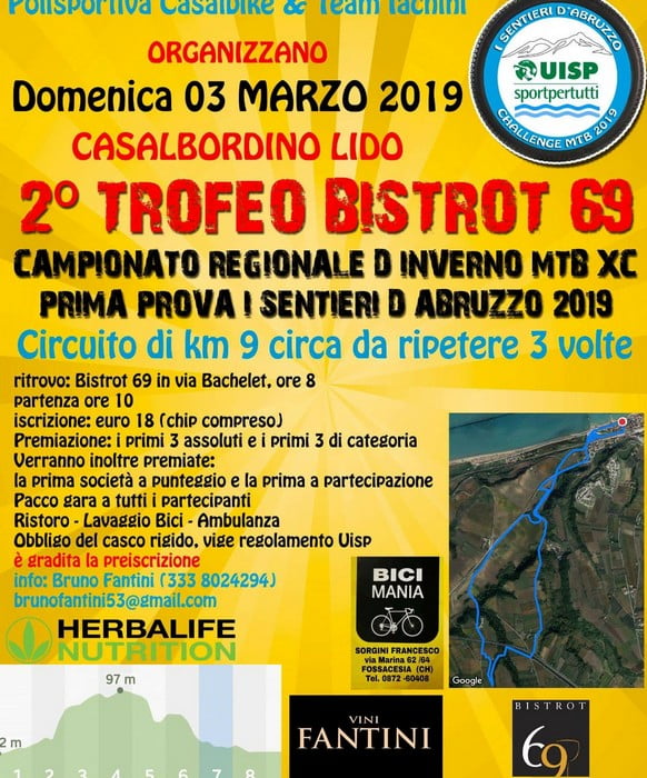 Il Trofeo Bistrot 69 è gara valevole per il campionato regionale d’inverno Uisp ed inaugura ufficialmente la stagione 2019 del neonato circuito I Sentieri d’Abruzzo. Con il ritrovo alle 8:00 in Via Bachelet, la partenza alle 10:00 e le iscrizioni alla quota di 18 euro, la gara propone un percorso ad anello di 9 chilometri da ripetere tre volte con 148 metri di dislivello a giro: da superare la Salita delle Volpi e delle Noci ma anche le discese Indian e Rivo Maris sono tutte da affrontare d’un fiato. Lo staff del Bistrot 69 di Antonio Manes ha predisposto tutto nei minimi dettagli anche il dopo gara con il ristoro per tutti i partecipanti e la possibilità di rimanere a pranzo a un prezzo convenzionato di 15 euro (un primo e un secondo) per una manifestazione pronta a regalare tante emozioni a tutti gli sportivi e non solo che giungeranno a Casalbordino Lido.