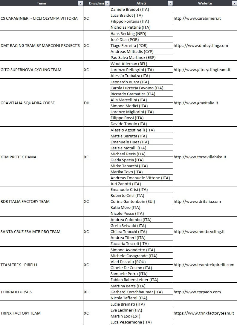 Di seguito l’elenco dei team UCI italiani con i rispettivi atleti (cliccare sull’immagine per ingrandire):