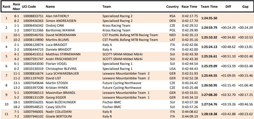 In questa prima tappa si è imposta la coppia formata dal danese Simon Andreassen e dal sudafricano Alan Hatherly del team Specialized Racing. In 2^ posizione, staccati di circa 24 secondi, il ceco Ondrej Cink e il polacco Bartlomiej Wawak (Kross Racing Team). A completare il podio la coppia formata da David Nordemann e Martin Blums.