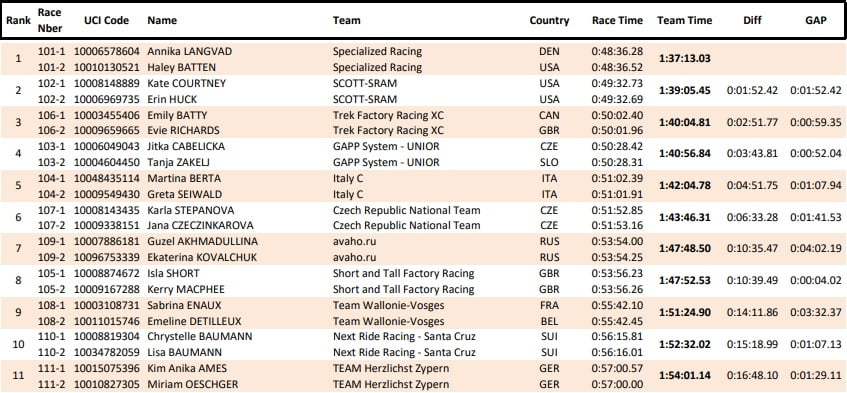 Anche tra le donne si è imposto il team Specialized Racing, con la danese Annika Langvad e la statunitense Haley Batten che hanno avuto poche rivali, vincendo con quasi 2 minuti di vantaggio sul duo dello Scott-Sram MTB Racing, Erin Huck e Kate Courtney.