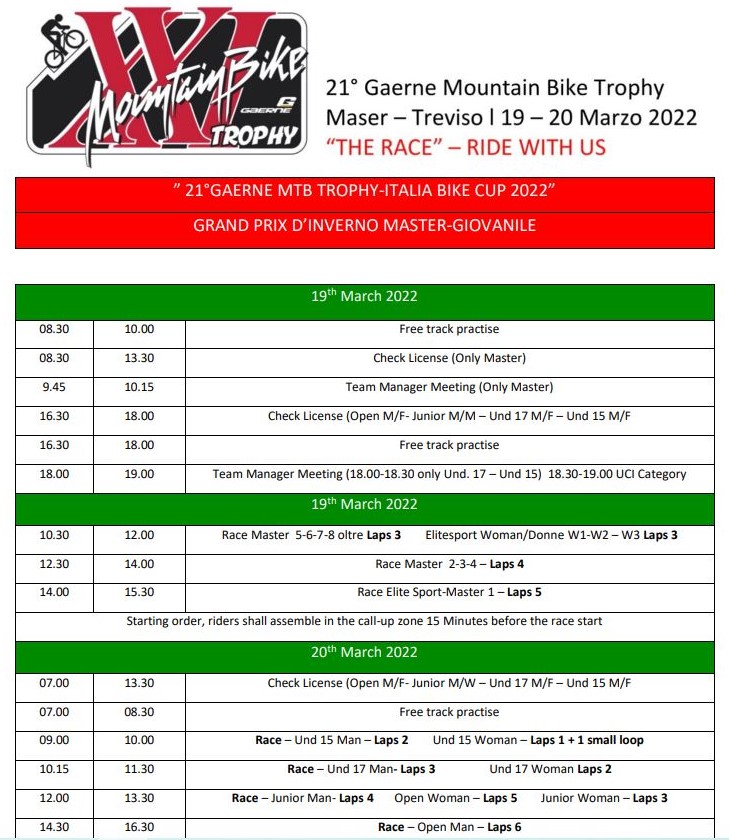 “Le attese sono molte per questo ritorno in un contesto internazionale. Stiamo facendo, grazie allo sforzo dell’intera società, delle associazioni, enti, comune, sponsor e volontari, qualcosa di importante. Lo sappiamo. Come sappiamo che non sarà facile poter uguagliare quelle edizioni che portavano a Maser i più forti interpreti del mondo off road internazionale. Sono comunque convinto che ci saranno grossi numeri alla due giorni della Gaerne Mtb Trophy- conclude Gasparetto- come sono convinto che arriveranno atleti di grande spessore. Sarà sicuramente una due giorni di grande richiamo. Vi aspettiamo numerosi“.