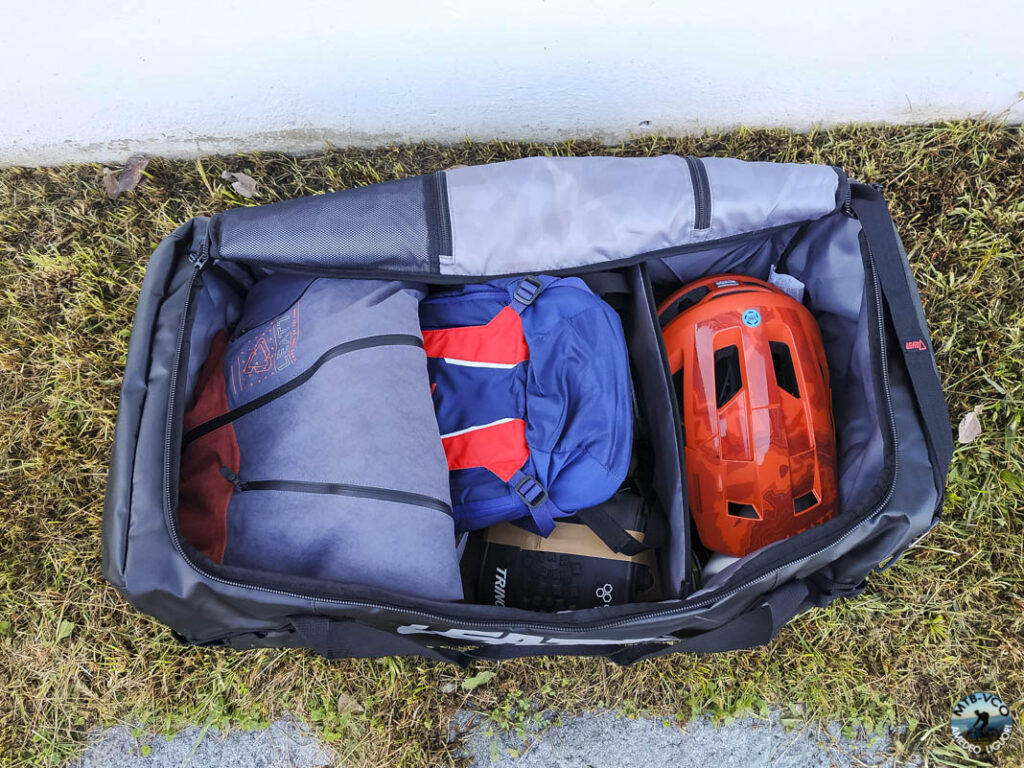 Al primo contatto la Duffel Bag si presenta particolarmente robusta e capiente, al punto che sembra quasi ci possa entrare una bici completamente smontata. Scherzi a parte, le dimensioni sono molto generose e dà subito l’impressione di poter contenere tutto ma proprio tutto il necessario per un viaggio con la mountain bike.