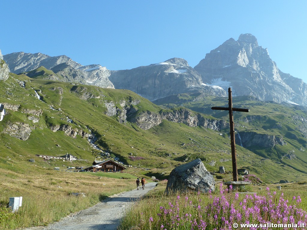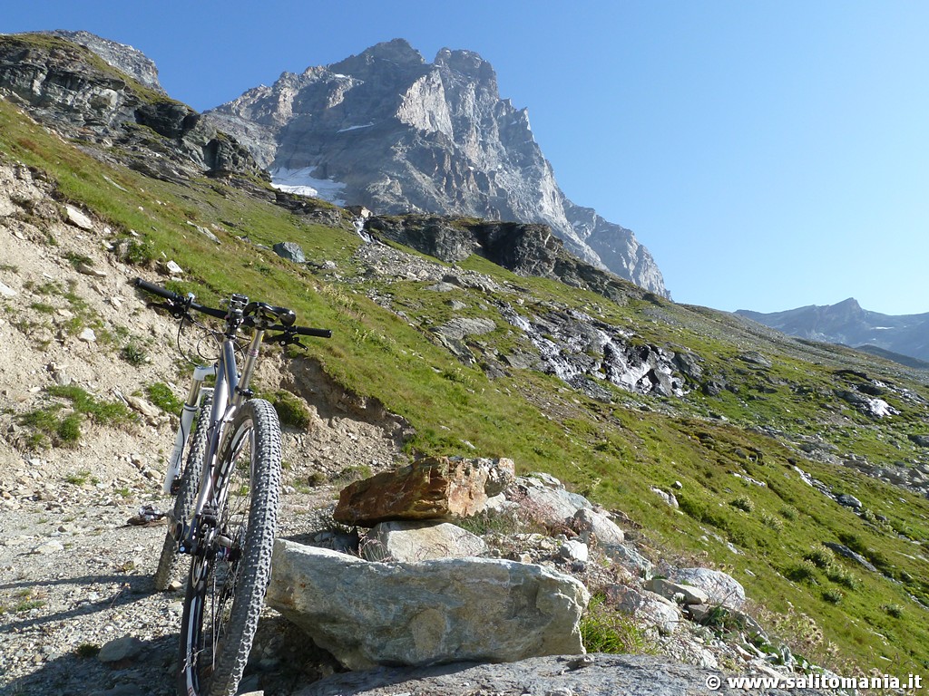 La giornata si preannuncia subito torrida: appena qualche colpo di pedale e sono già in un bagno di sudore. La salita al Rifugio Lo Riondè (o Duca degli Abruzzi come si chiamava sino a pochi anni orsono) si svolge su una bella strada sterrata che sale defilata rispetto alle brutture edilizie che hanno fatto scempio della conca del Breuil: pendenze oneste, mai particolarmente impegnative. Il Cervino è il vero leif motiv di questa salita, è lì che incombe sopra la tua testa, in tutto il suo aspetto magnifico e al tempo stesso tenebroso: solitamente incappucciato già dalle prime ore del giorno, oggi si svela completamente in tutta la sua elegante sinuosità, impossibile restare indifferenti.