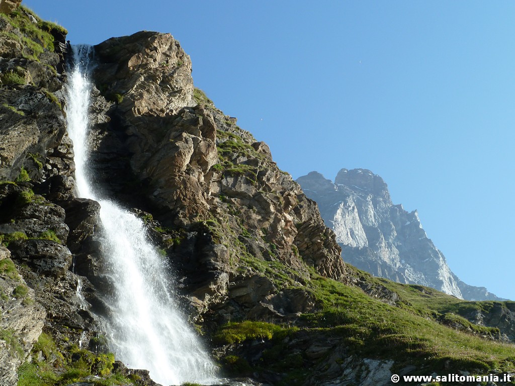 Si arriva in pochi minuti alla bella chiesetta che ricorda i caduti del battaglione Monte Cervino q. 2144, splendido balcone panoramico sul Breuil: quindi la salita continua piuttosto morbida sino ad una fascia rocciosa da cui scende una spumeggiante cascata, qui le pendenze si fanno più impegnative ma la vista sulle Grandes Murailles è così bella da far dimenticare anche le fatiche.