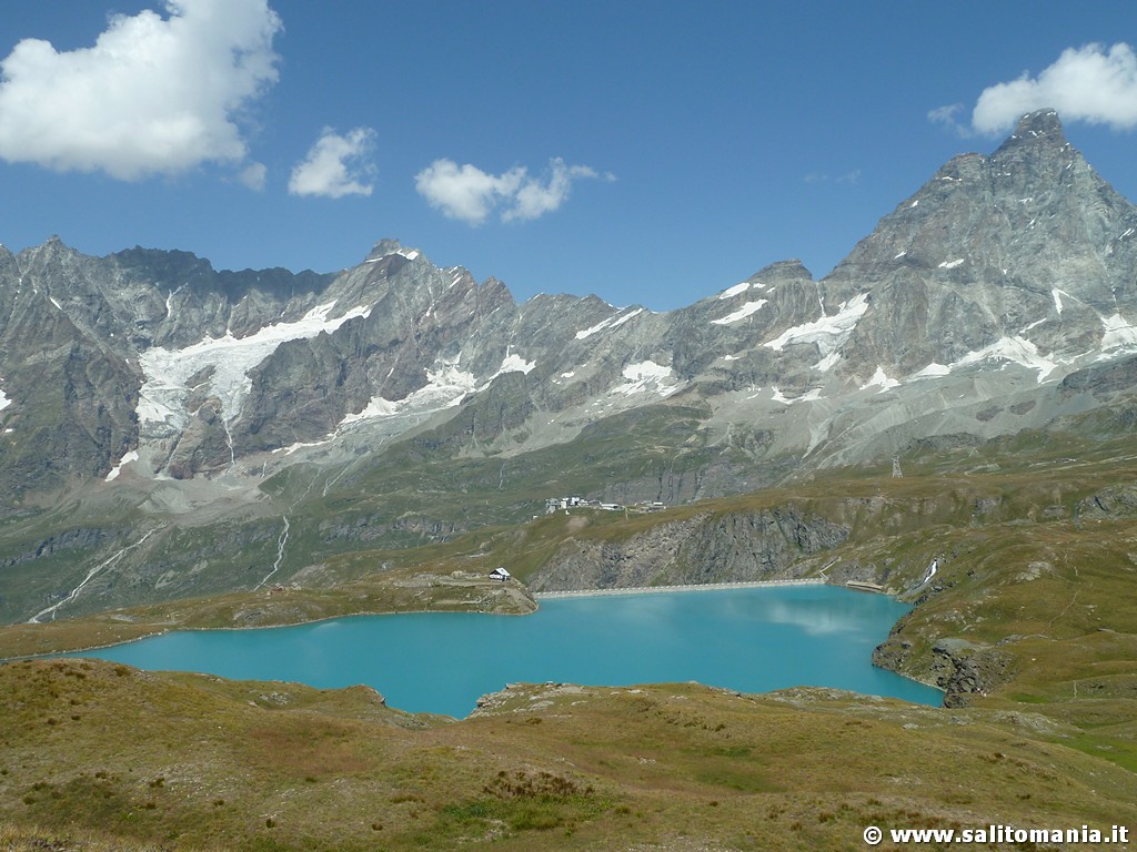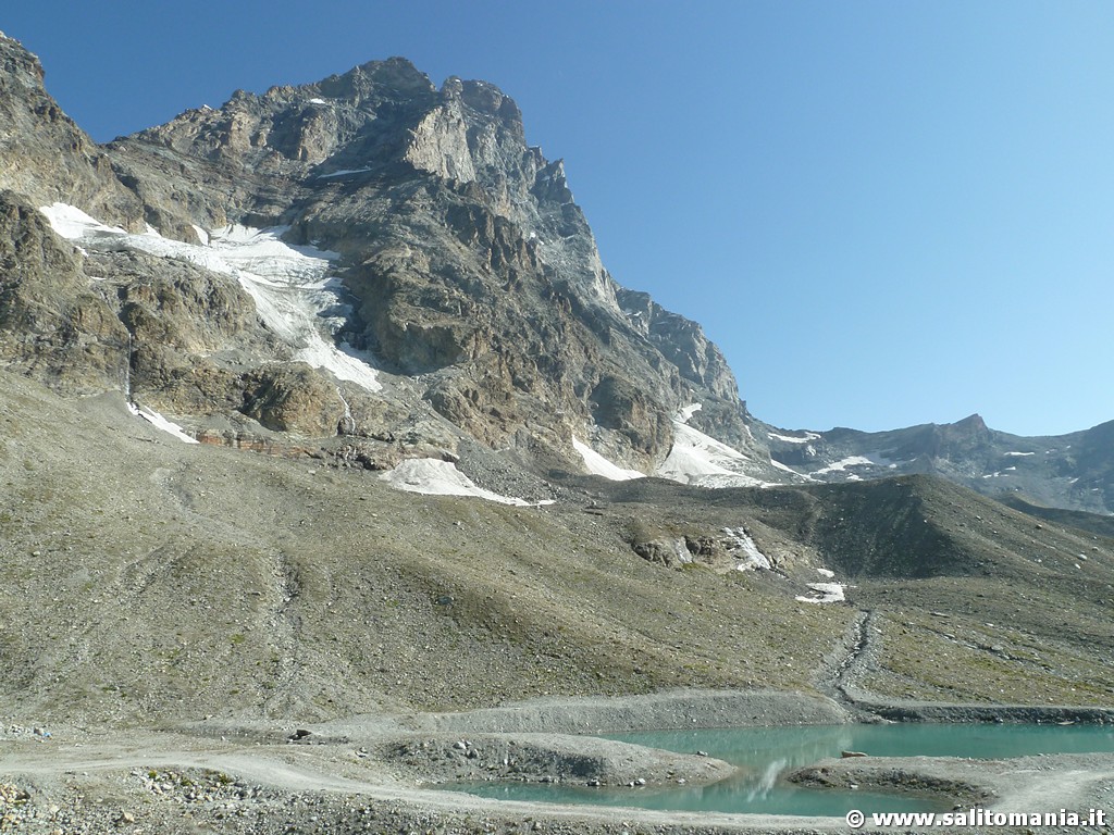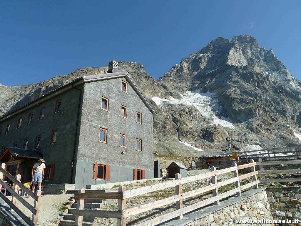 Alle spalle del rifugio un piccolo laghetto di fusione ove si specchia la sagoma del Cervino, che da quassù si lascia ammirare ancora meglio: ben visibile la sagoma del rifugio Carrel, ai piedi della Cresta del Leone.