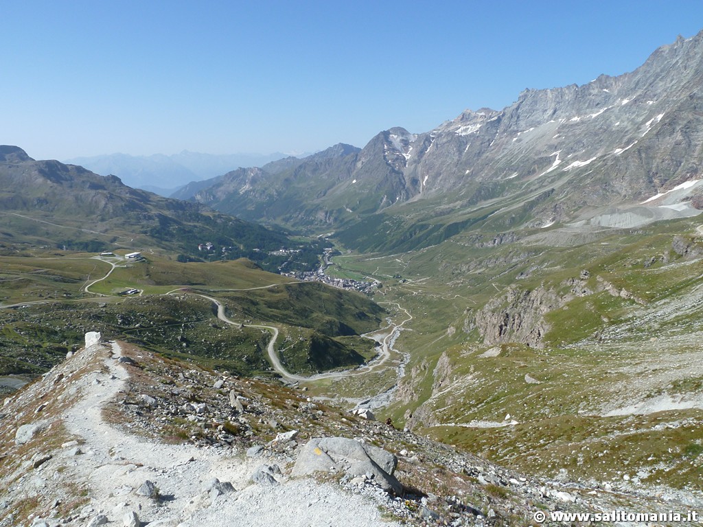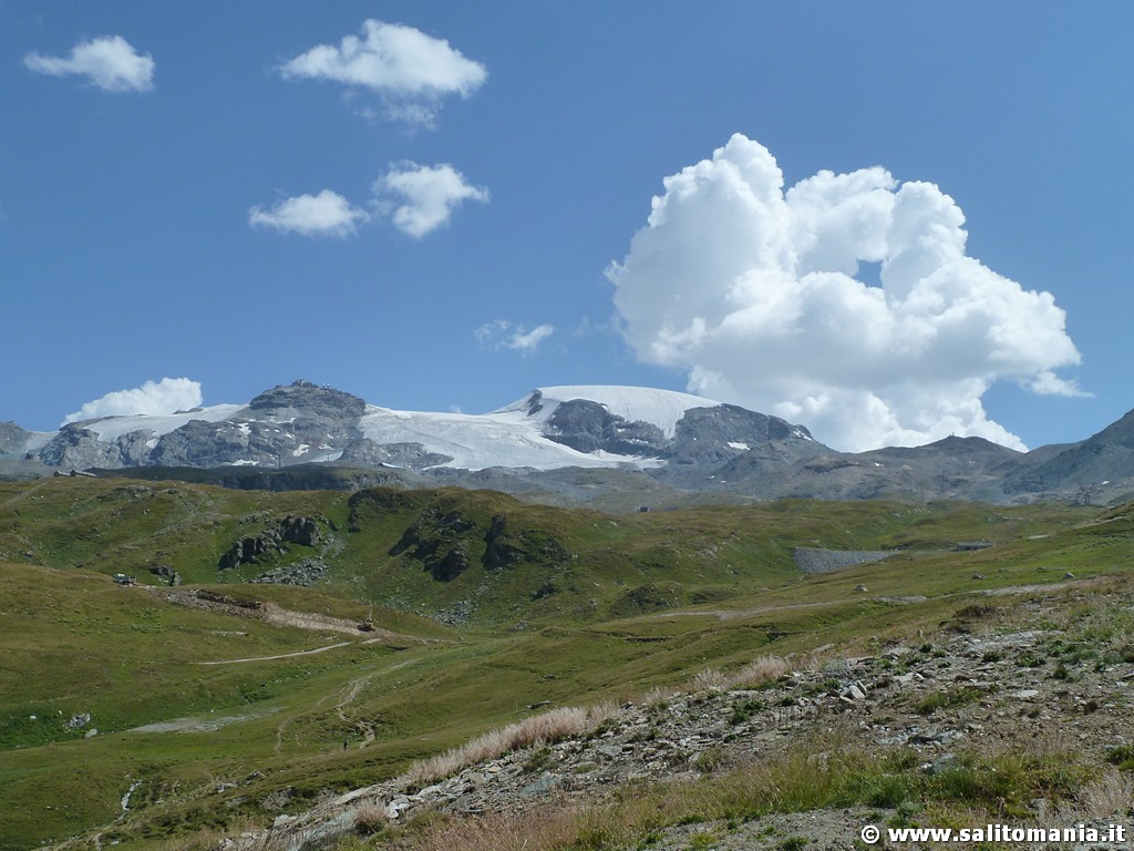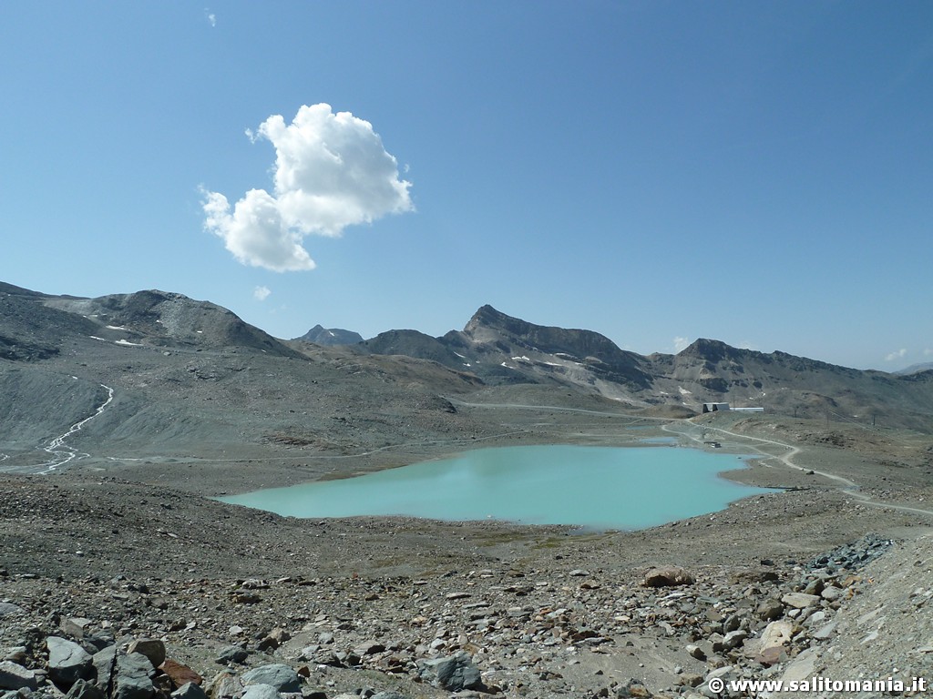 Ora comincia la seconda parte della giornata: l’ambizioso programma di raggiungere il Passo del Plateau Rosa e da lì sconfinare in Valtournenche per il Colle delle Cime Bianche purtroppo non è alla mia portata. Oggi il gran caldo e le non buone condizioni fisiche mi trovano spossato e privo di energie: però lo stesso voglio provare a raggiungere almeno i laghi di Cime Bianche per poi scendere a Cervinia lungo la pista del Ventina, sarebbe davvero emozionante, dopo averci sciato sopra per centinaia di volte. Così eccomi ripartire lungo la sterrata di servizio lungo la linea della seggiovia Plan Maison che risale verso il Colle del Teodulo: una breve deviazione mi porta a visitare il laghetto di Tramail, brulicante di turisti, poi faticosamente viste le pendenze mostruose mi porto alla partenza della seggiovia del Fornet.