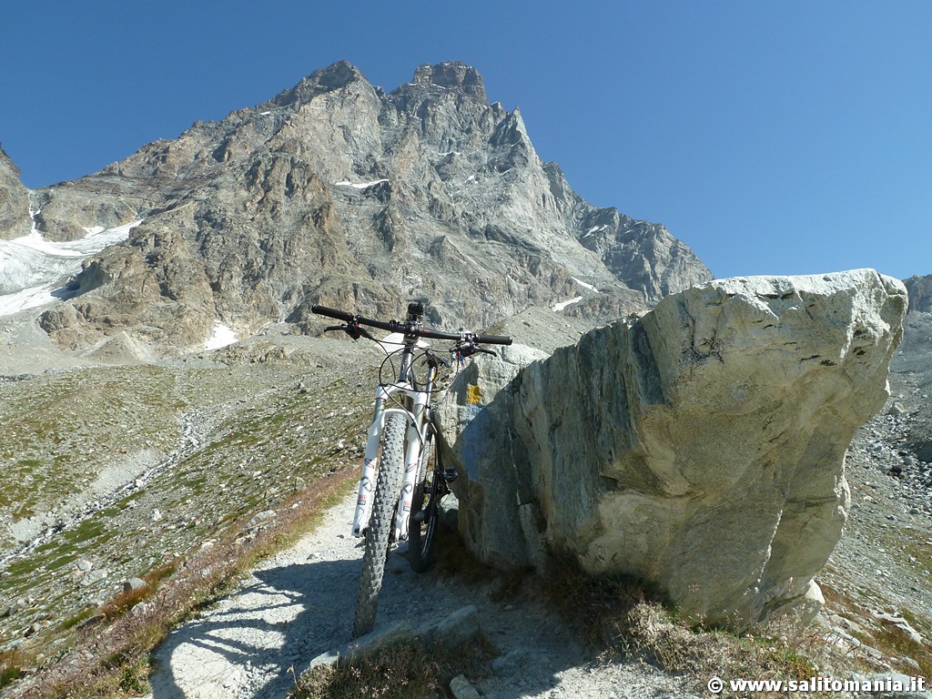 Incontro numerosi alpinisti che daranno l’assalto domani alla montagna, li saluto con un pizzico di invidia ed eccomi pronto ad affrontare la traversata verso Plan Maison lungo il sentiero 35: è un single trail molto bello, che corre a mezzacosta in un suggestivo ambiente morenico, non sempre pedalabile (alcuni minuti di portage) ed oggi particolarmente frequentato da una numerosa comitiva di turisti di mezza età non propriamente avvezzi a camminare in montagna. Li lascio sfilare in tutta tranquillità, d’altro canto il panorama è talmente bello che proprio non ci si annoia.
