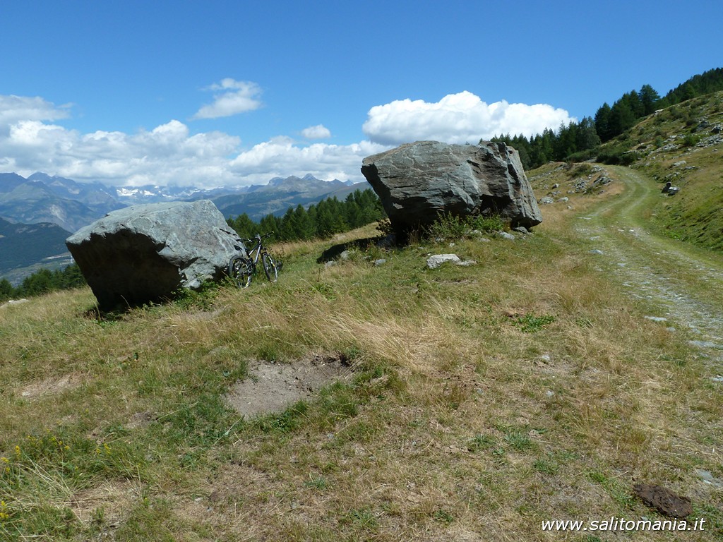 E qui comincia il bello: pochi metri di asfalto e appena lasciate le case della frazione, sulla destra alcuni sbiaditi bolli gialli segnalano il sentiero 1 per Chatillon. Si tratta della vecchia mulattiera che raggiungeva Bellecombe prima della costruzione della strada: perfettamente agibile e ben mantenuta, riserva al biker un divertimento assoluto con facili tornantini e sezioni selciate.