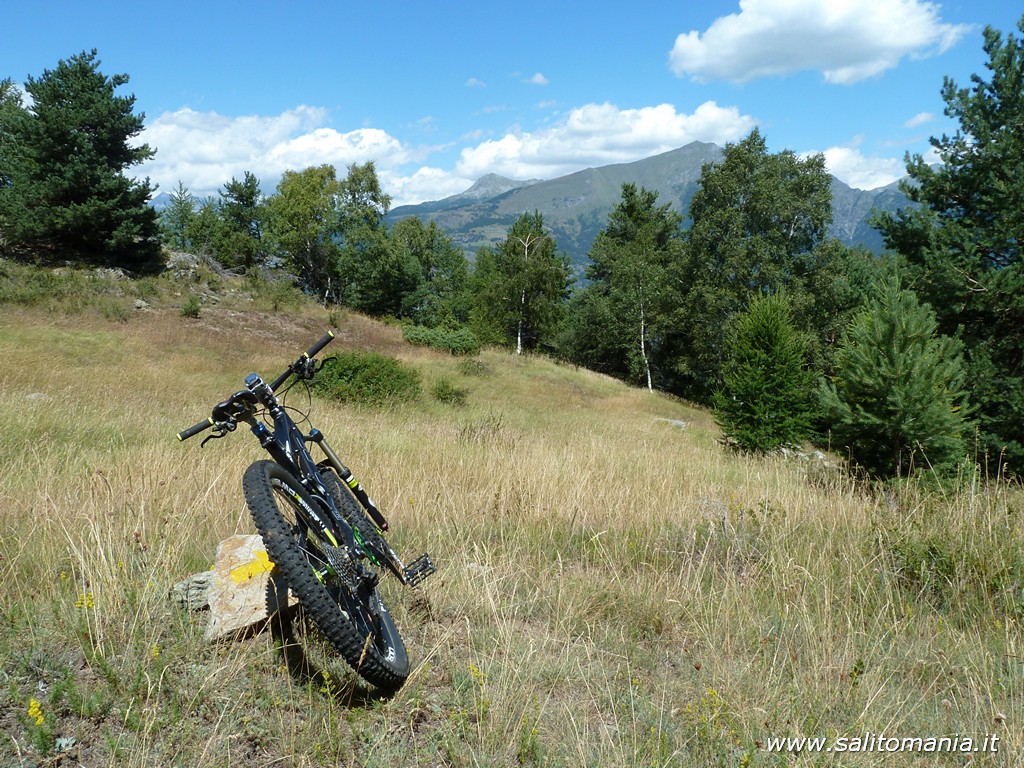 Si raggiunge comunque agevolmente l’alpeggio abbandonato di Pra Garin mt 1535, con le sue baite fatiscenti ed il grande fornale invaso dalla vegetazione che ispirano tanta tristezza: qui vi sono due alternative, quella più semplice prevede di individuare una traccia sulla destra che dovrebbe essere in gran parte pedalabile e giungere alle baite di Mont Ros, dove si scende poi a valle lungo una ripida interpoderale. Ovviamente io scelgo la più complicata, e rimango sul sentiero 3, vagamente segnalato (prestare attenzione a non perdere i bolli gialli). Beh, diciamo che è un sentiero “per intenditori”, scarsamente ciclabile per via del fondo troppo sconnesso e discontinuo.
