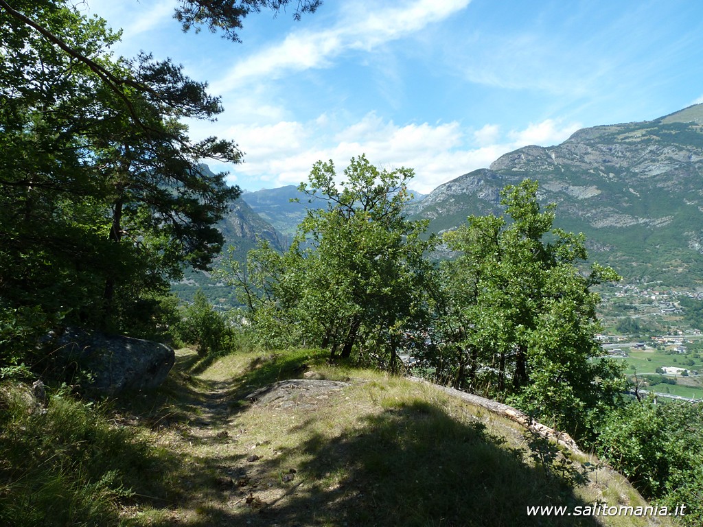 E dopo il cappello introduttivo, due note di cronaca: logistica semplicissima, uscita dall’autostrada a Chatillon, poche centinaia di metri e si parcheggia nei pressi della stazione ferroviaria. Si attraversa la Dora e si risale a Pontey, su asfalto, lungo la cosiddetta strada dell’Envers, tranquilla e poco trafficata: si prosegue verso Chambave sino ad incontrare, dopo un duro strappo, il bivio a sinistra indicante le frazioni alte di Cloutra e Verthuy. La salita prosegue ben ombreggiata, con pendenze decise, sino a Cloutra mt 1050, bellissima frazione con ampie vedute verso il fondovalle: qui finisce l’asfalto e inizia l’interpoderale verso Valmeriana, che risale placidamente il fitto versante boscoso con lunghi traversi e pochi tornanti.