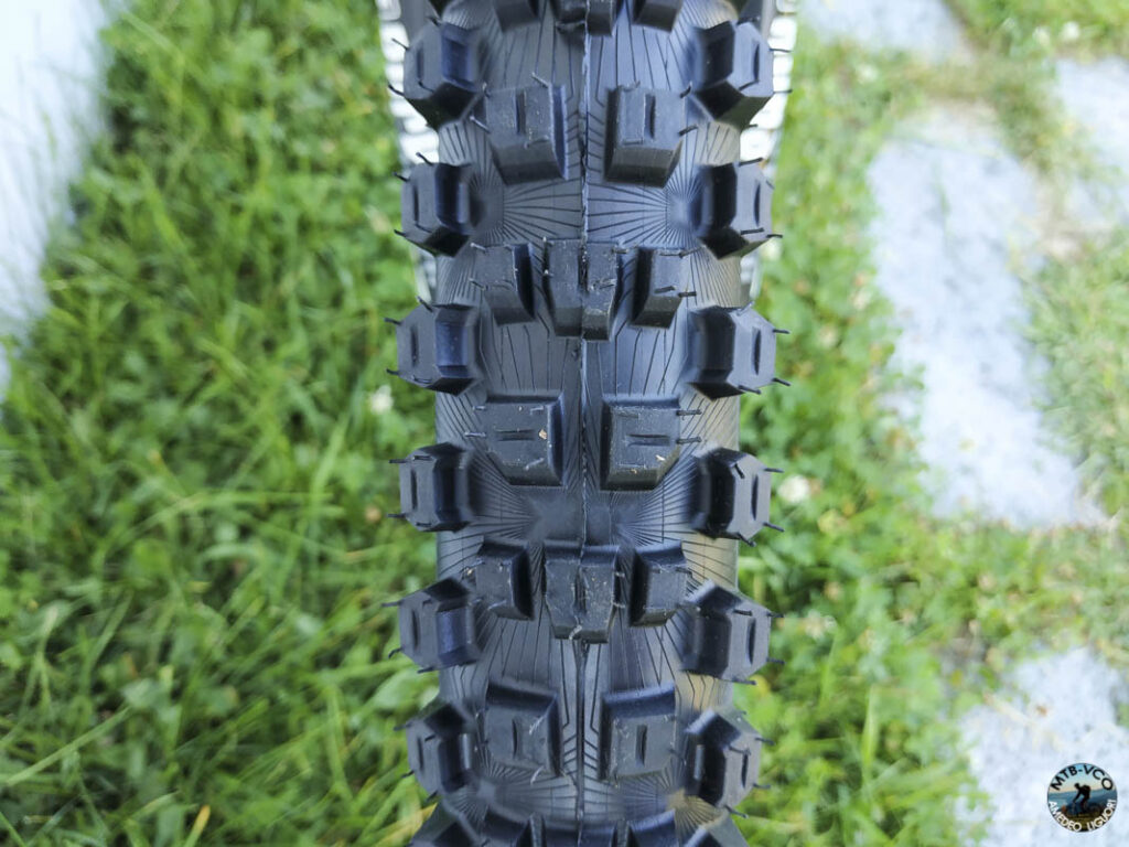 Nella parte centrale del battistrada troviamo un canale non completamente definito ma sufficiente a fornire una buona direzionalità. Le gomme, infatti, hanno mostrato una buona prevedibilità nei cambi di direzione, grazie anche alla presenza di tasselli di transizione tra quelli centrali e quelli laterali, che accompagnano bene in fase di piega e non richiedono manovre decise. La carcassa Enduro è perfetta in tale ambito e dona il giusto supporto quando si spinge sui pedali.