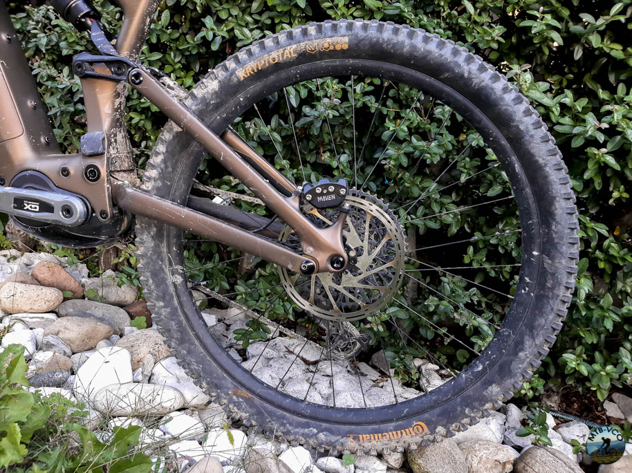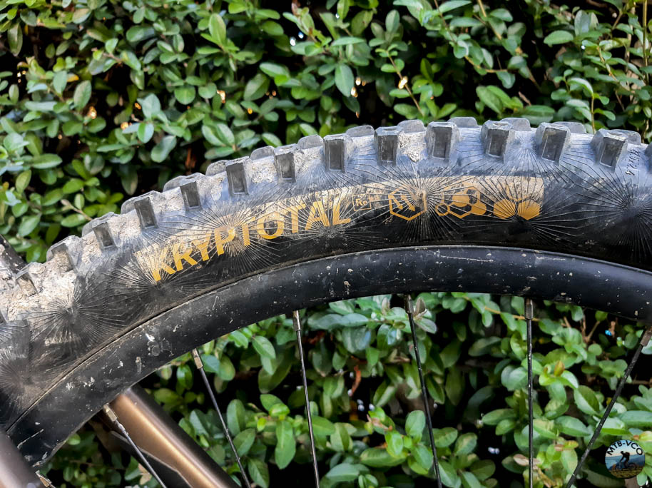 Il Kryptotal-Re montato al posteriore si è rivelato altrettanto prestazionale e un buon abbinamento all’Argotal all’anteriore. Il disegno è leggermente direzionale nella fila centrale dei tasselli e dalla densità superiore di tappi che se da un lato “aggrappano” meno dell’Argotal in frenata, aiutano ad avere più scorrevolezza essendo disegnato in maniera specifica per essere montato posteriormente anche su mtb non elettriche.
