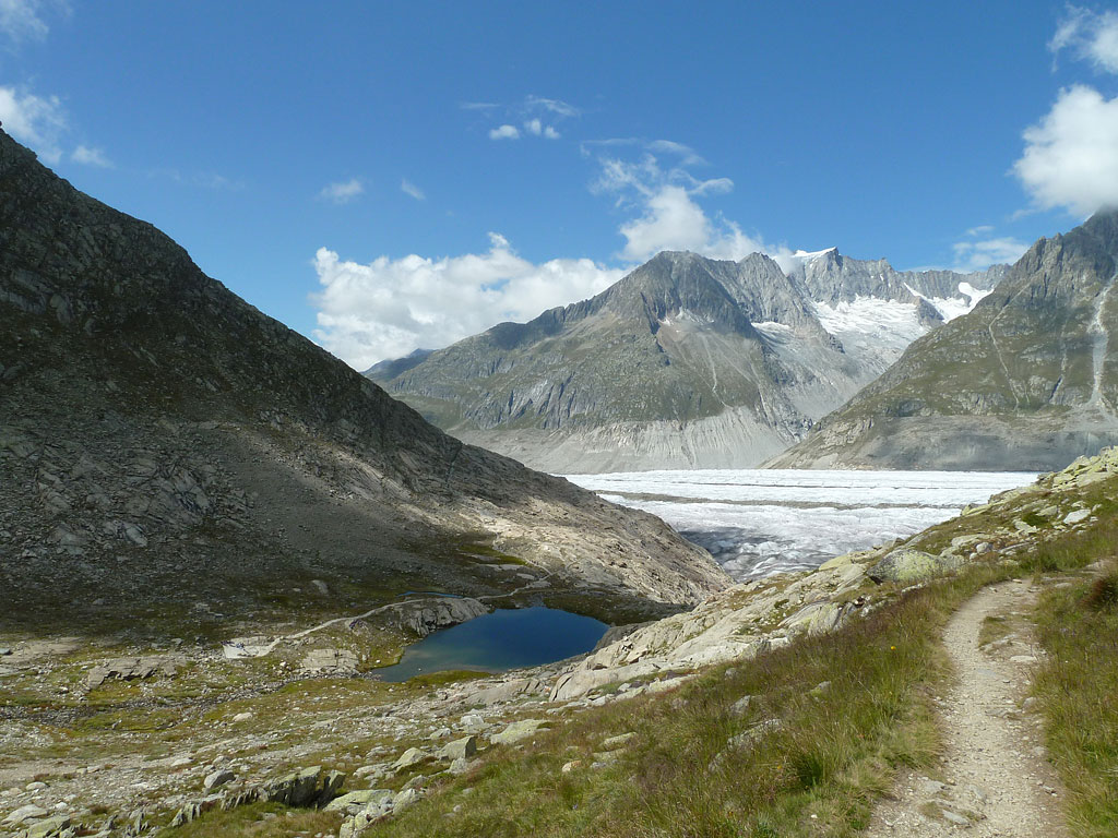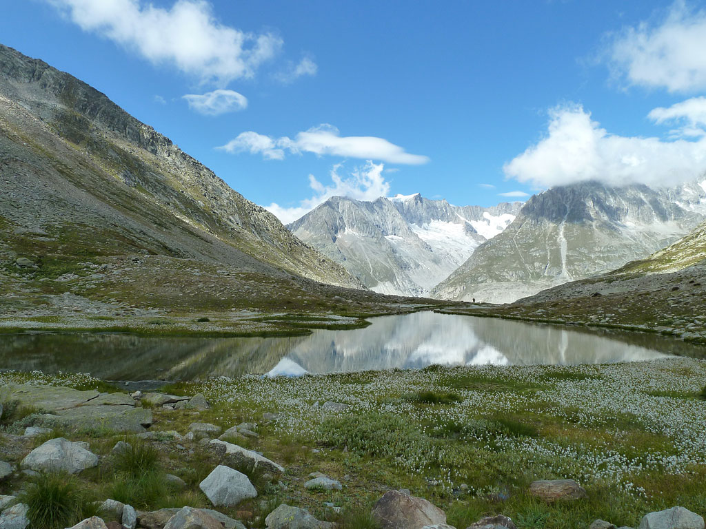 L’uscita dal tunnel ci catapulta in un nuovo mondo di roccia e ghiaccio: un delizioso laghetto contornato da eriofori invita ad una sosta. Per godere della vista sul ghiacciaio conviene seguire un sentierino pianeggiante, in gran parte ciclabile, che porta a Platta: ora l’Aletsch si svela in tutta la sua imponenza e maestosità, impreziosito dalle acque color turchese del Marjelesee, piccolo laghetto posto ai suoi bordi.