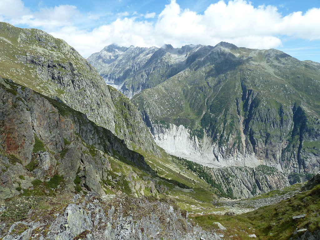 La vista del grande ghiacciaio Aletsch, pur sofferente per le variazioni climatiche degli ultimi anni, è di quelle che tolgono il fiato: ancora più emozionante se guadagnata dopo tanto sudore e fatica. Ecco in sintesi la giornata di oggi, all’insegna della sofferenza per le gambe ancora imballate dall’ultima uscita e proseguita ancora peggio con la infelice decisione di scendere per la Fieschertal, lungo un sentiero che si è dimostrato ben poco pedalabile.