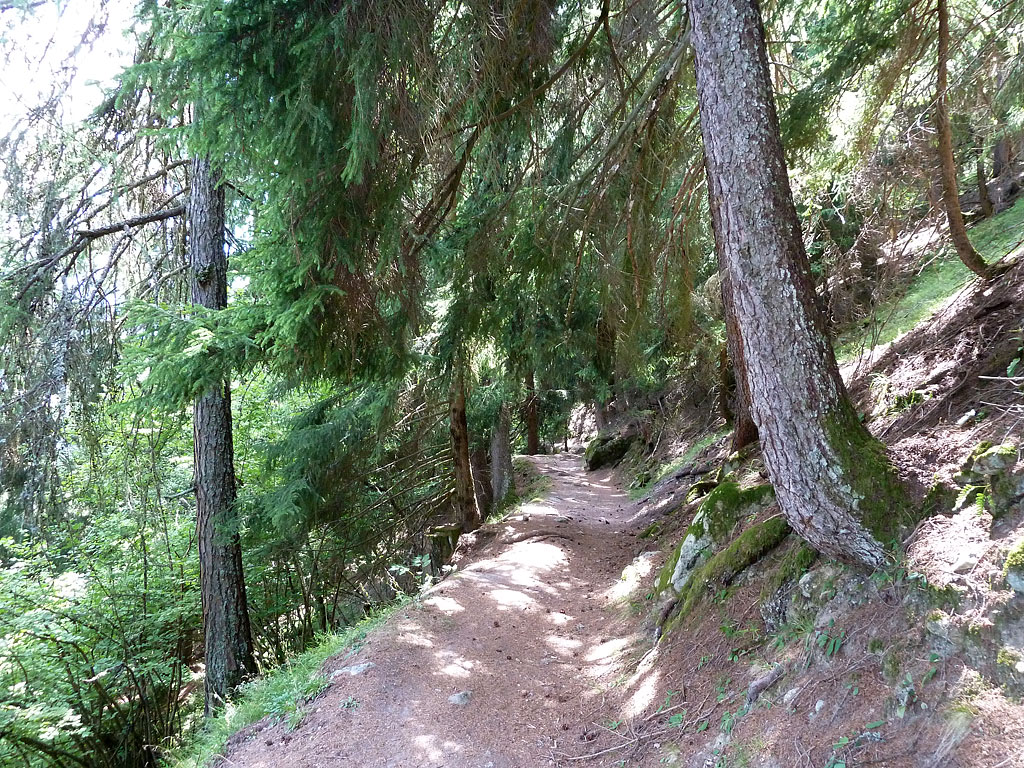 Una deliziosa traccia inerbita si insinua a mezzacosta prima di entrare in un bellissimo bosco di larici: sempre ciclabile, la traccia si fa via via più esile prima di piombare con decisione su Fiesch. E’ la parte di discesa più bella e piacevole, e mi fa dimenticare le fatiche appena patite.