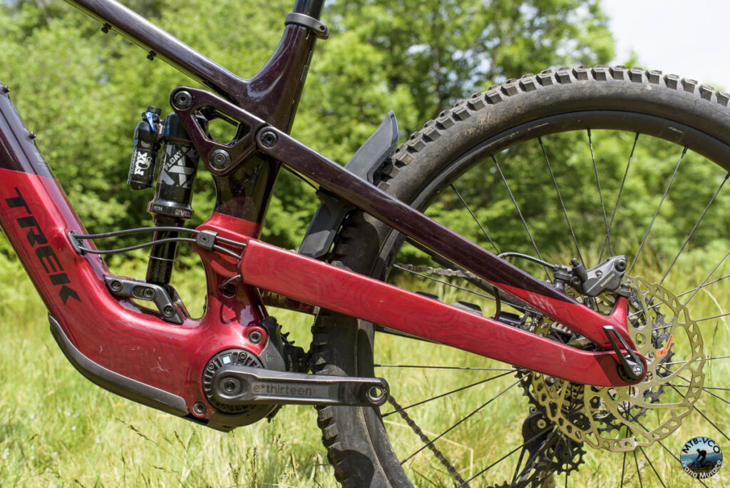 Solitamente il punto debole delle bici con fulcro principale in posizione elevata è l’Anti-Rise. Un Anti-Rise elevato si traduce in una sospensione meno attiva e in una perdita di corsa e trazione, caratteristica che dovrebbe essere mitigata nella Slash+ dalla presenza dello schema ABP (Active Braking Pivot) brevettato da Trek. Lo schema si compone di un quadrilatero il cui fulcro principale è coassiale al mozzo posteriore, con l’obiettivo di svincolare il lavoro della sospensione dall’azione frenante e garantire, così, una sospensione più attiva sotto l’azione frenante e, di conseguenza, un miglior controllo del mezzo.