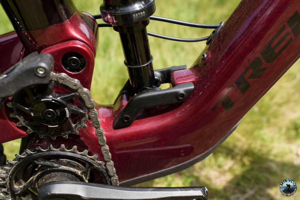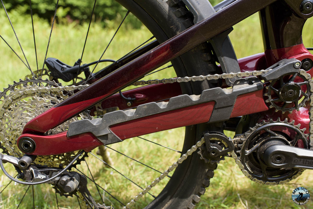 In aggiunta, in posizione elevata è presente una puleggia tendicatena che serve ad elimina il contraccolpo del pedale (Pedal Kickback) provocato dalla sospensione a perno alto, assicurando nel contempo anche un effetto anti-squat a favore dell’efficienza di guida. Il guidacatena inferiore integrato serve, invece, a ridurre la tensione sul cambio.