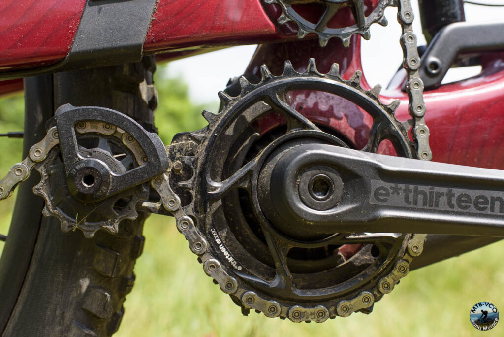 Trasmissione Shimano Deore XT a 12 velocità, quindi con cassetta pignoni 10-51T e corona E*thirteen E*spec Plus da 32 denti.