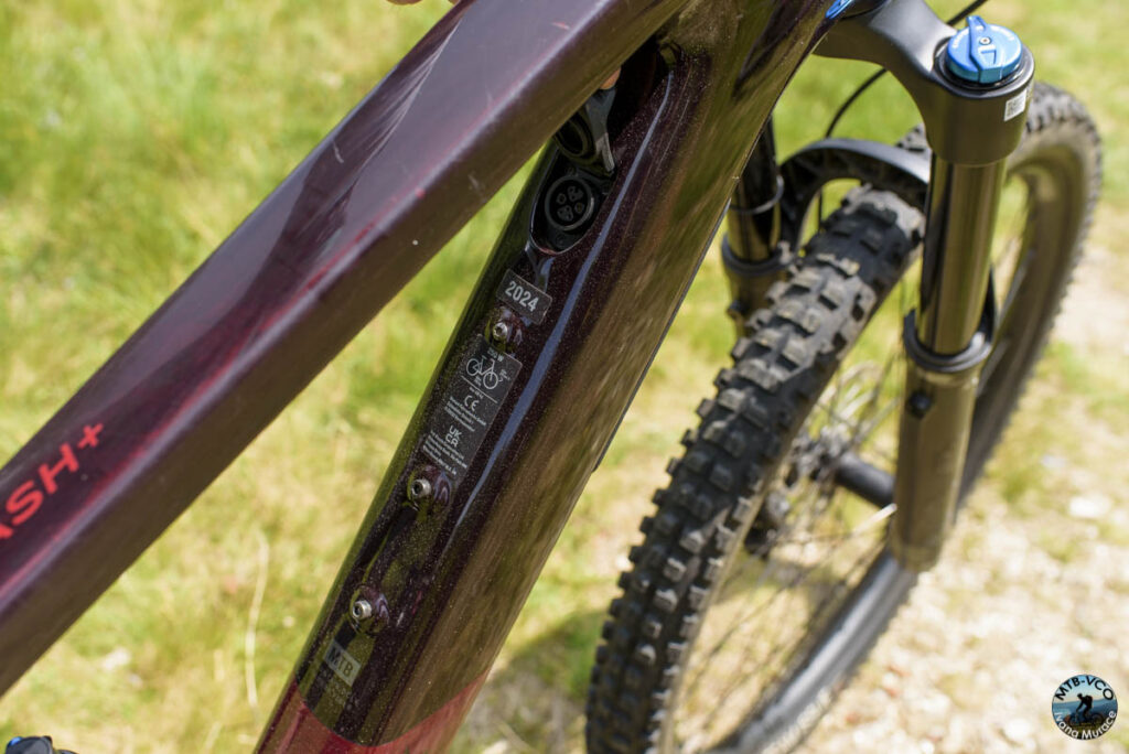 Anche sulla Slash+ spicca lo schema di sospensione a perno alto (High Pivot) che caratterizza già la sorella senza motore, così come il formato ruota misto (29” anteriore e 27.5” posteriore).