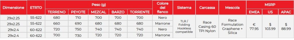 La nuova gamma di pneumatici mountain bike XC Race di Vittoria sarà disponibile dal 25 giugno, offrendo sia ai professionisti che agli appassionati di MTB il set-up ideale per affrontare ogni situazione. La nuova line-up è composta dai battistrada già conosciuti — Terreno, Peyote, Mezcal e Barzo — e si arricchisce oggi di un nuovo modello pensato per le condizioni fango: il Torrente.