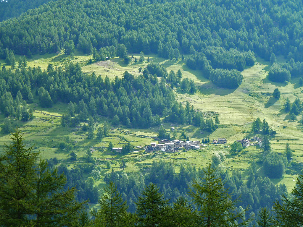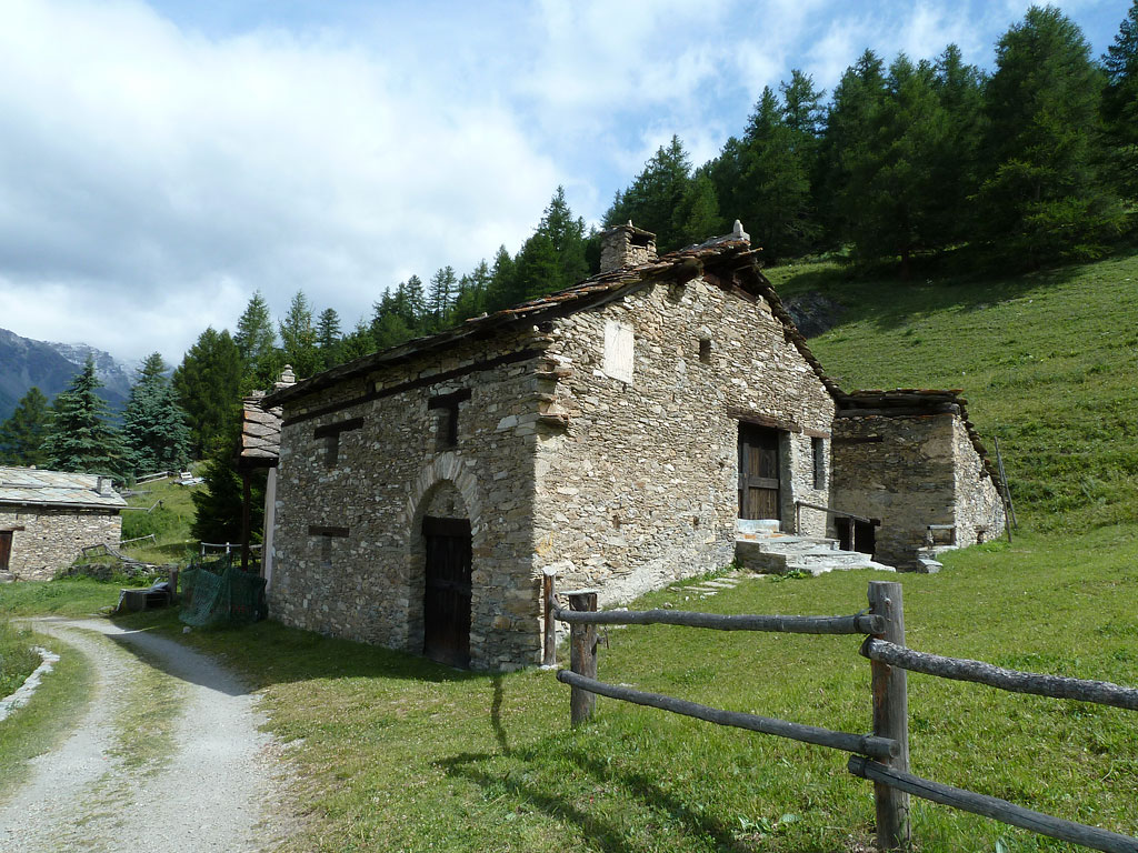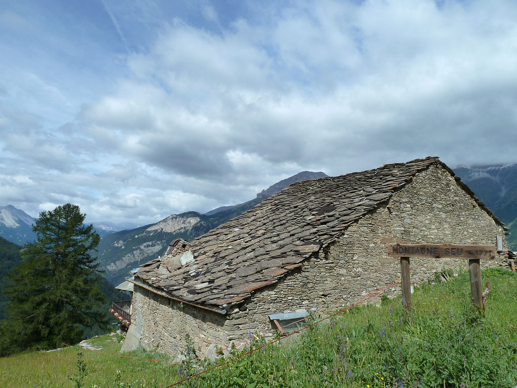 Rapido dietrofront e ritorno al bivio per Montagne Seu: decido di arrivare lì, per lo meno in caso di pioggia c’è un accogliente rifugio. La strada forestale ora corre prevalentemente in falsopiano prima di perdere circa 100 metri di dislivello e giungere alla borgata di Montagne Seu mt 1770, in splendida posizione panoramica.