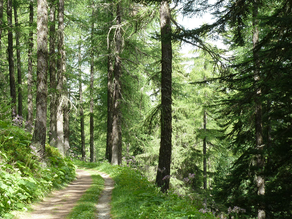 Si risale dolcemente nel fitto del bosco che sprigiona le sue essenze: è un vero piacere salire su queste strade, che disegnano sinuosi tornanti dalle pendenze sempre regolari. Siamo in ombra, e fa decisamente freddo nonostante il riparo dal vento offerto dal bosco: si procede sempre diritto, tralasciando i diversi bivi (ben segnalati) sino a giungere nei pressi dell’area attrezzata di Serre Blanche, mt 1745, nei pressi della borgata Monfol (Sauze d’Oulx).