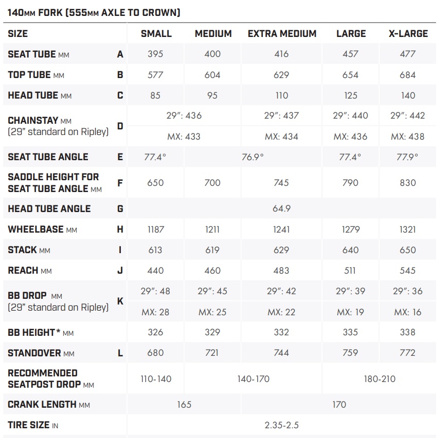 Le escursioni della Ripley AF salgono a 130 mm al posteriore e a 140 mm all’anteriore, con geometrie progressive per garantire maggiore reattività, mantenendo la stabilità quando aumenta la velocità.