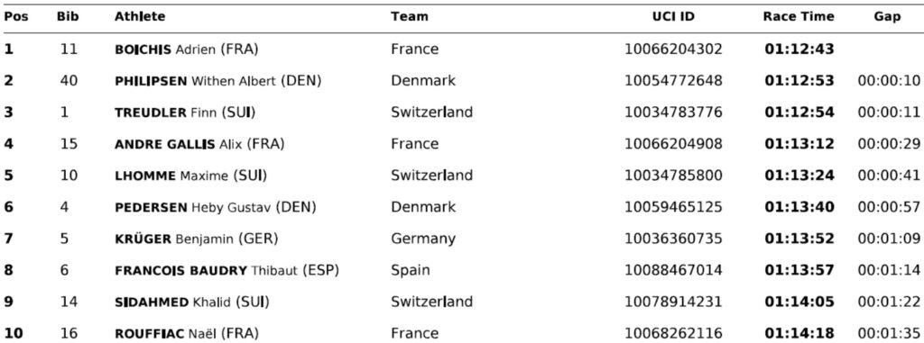 Tra gli Under 23 è il francese Adrien Boichis ad aggiudicarsi il titolo continentale con il tempo di 01:12:43. Il transalpino ha preceduto il danese Withen Albert Philipsen, medaglia d’argento in 01:12:53 e lo svizzero Finn Treudler, terzo in 01:12:54.