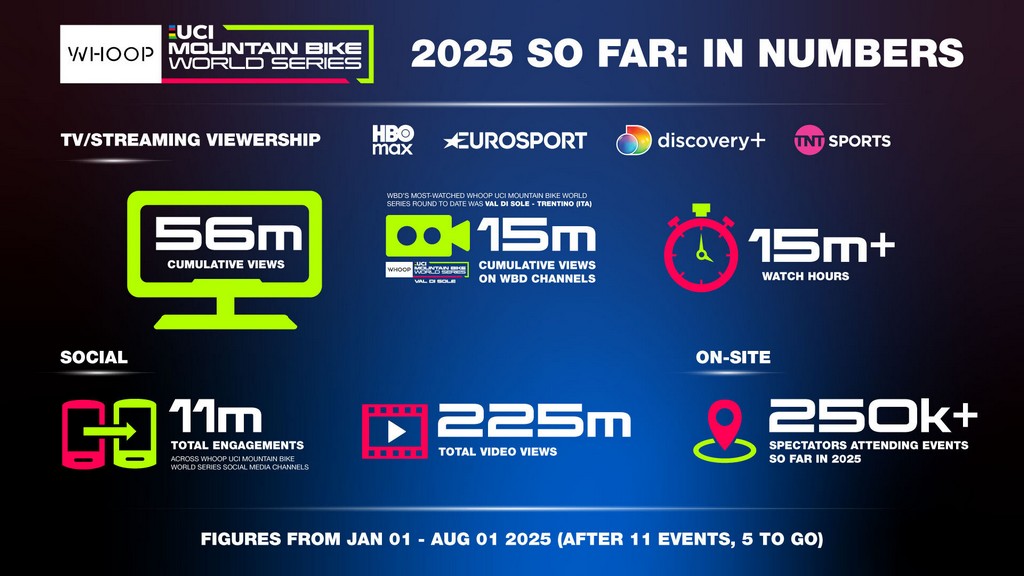 Finora in questa stagione, milioni di spettatori in tutto il mondo hanno potuto seguire la WHOOP UCI Mountain Bike World Series in diretta e on demand, sia in streaming che sui canali e sulle piattaforme di WBD (HBO Max, Eurosport, discovery+ e TNT Sports), con 56 milioni di visualizzazioni cumulative e 15 milioni di ore di visione .