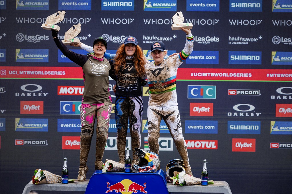 Gracey Hemstreet (Norco Race Division) e Ronan Dunne (Mondraker Factory Racing DH) conquistano due spettacolari vittorie in un torbido round della Coppa del Mondo di downhill a Les Gets, Alta Savoia (Francia).