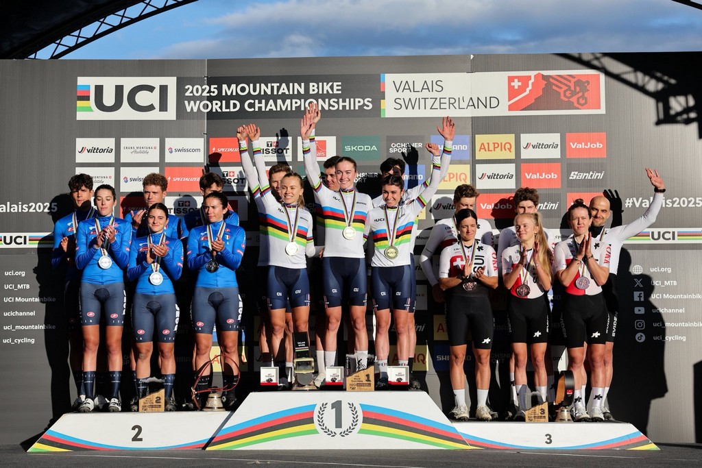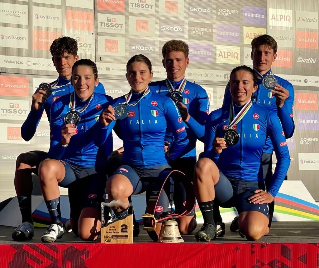 In attesa del lungo weekend dei Campionati del Mondo XCO 2025 del Vallese, in Svizzera, oggi è stato invece assegnato il titolo di campione del mondo di staffetta (Team Relay). La gara ha visto 14 nazioni sfidarsi a Crans-Montana, sul percorso di 3,8 km e 160 m di dislivello da percorrere per 6 giri, uno per ogni corridore. L’Italia schierava Juri Zanotti, Elian Paccagnella, Martina Berta, Elisa Ferri, Valentina Corvi e Ettore Fabbro, in quest’ordine di partenza.
