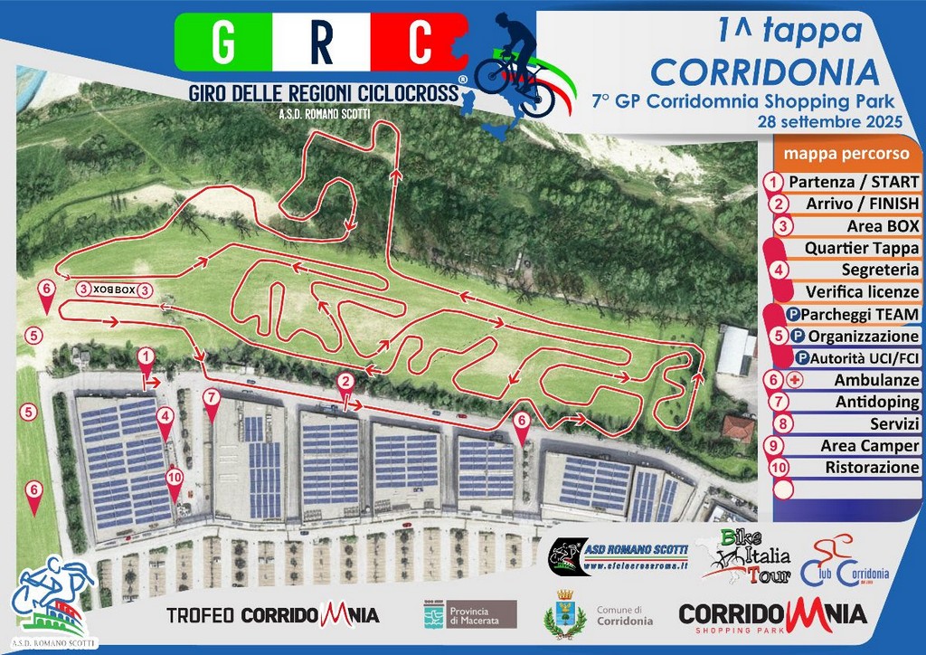«Il Presidente della Bike Italia Tour ASD, Francesco Baldoni, rivolge un caloroso saluto a tutta la carovana del GRC, augurando buon lavoro agli organizzatori, agli atleti e a tutte le società partecipanti. Il 28 settembre avrà inizio la prima gara della prima tappa del GRC, che si svolgerà presso il campo gara dello Shopping Park CorridoMnia, organizzata dalla Bike Italia Tour ASD con la collaborazione del Club Corridonia. Un ringraziamento particolare va all’Amministratore Delegato del CorridoMnia, Sig. Alfio Caccamo, che anche quest’anno, con la sua preziosa sponsorizzazione, sostiene la manifestazione. Il campo gara presenta poche variazioni rispetto alla scorsa edizione: un percorso veloce, tecnico e particolarmente insidioso in caso di pioggia. Il programma prevede inoltre uno short track per giovanissimi, in programma sabato pomeriggio, che si svolgerà in contemporanea alle prove ufficiali della gara GRC, su un campo gara appositamente dedicato».