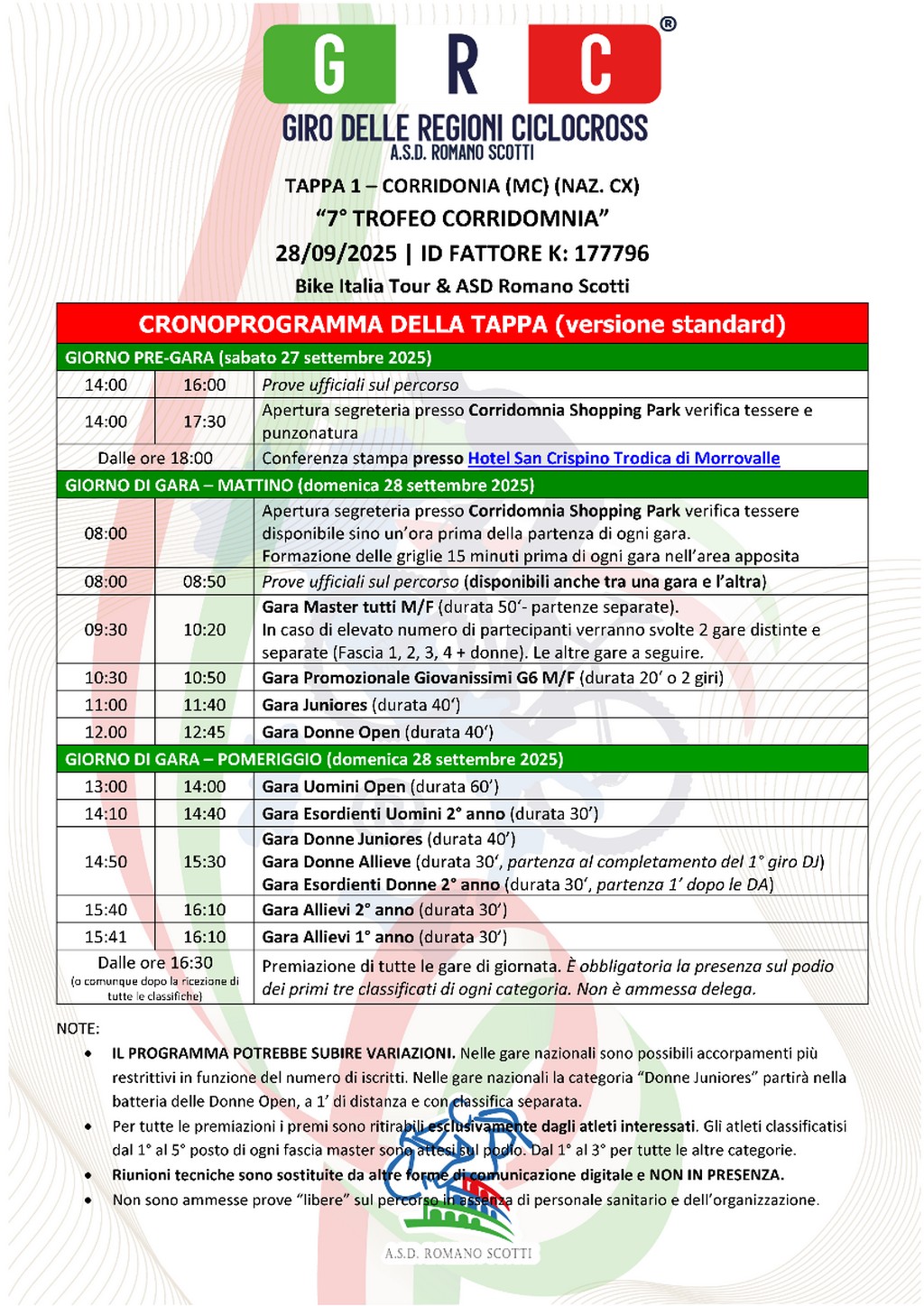 «Il Presidente della Bike Italia Tour ASD, Francesco Baldoni, rivolge un caloroso saluto a tutta la carovana del GRC, augurando buon lavoro agli organizzatori, agli atleti e a tutte le società partecipanti. Il 28 settembre avrà inizio la prima gara della prima tappa del GRC, che si svolgerà presso il campo gara dello Shopping Park CorridoMnia, organizzata dalla Bike Italia Tour ASD con la collaborazione del Club Corridonia. Un ringraziamento particolare va all’Amministratore Delegato del CorridoMnia, Sig. Alfio Caccamo, che anche quest’anno, con la sua preziosa sponsorizzazione, sostiene la manifestazione. Il campo gara presenta poche variazioni rispetto alla scorsa edizione: un percorso veloce, tecnico e particolarmente insidioso in caso di pioggia. Il programma prevede inoltre uno short track per giovanissimi, in programma sabato pomeriggio, che si svolgerà in contemporanea alle prove ufficiali della gara GRC, su un campo gara appositamente dedicato».