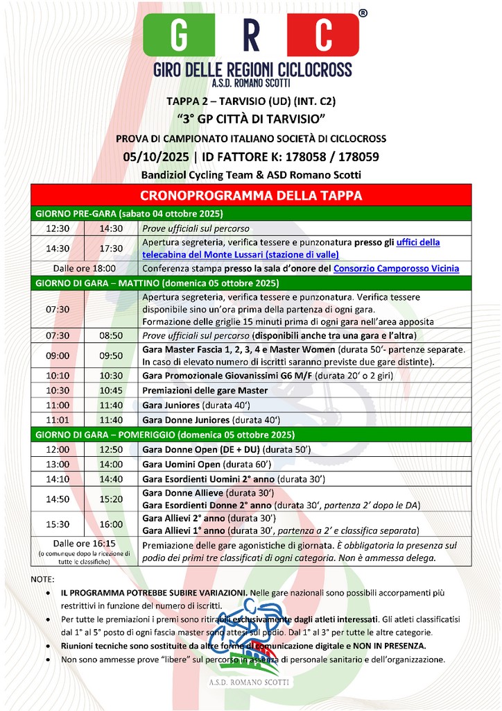 Le società sportive che ancora non hanno ottenuto i pass possono richiedere l’accredito per i box tecnici compilando il form online disponibile sul sito ufficiale https://www.ciclocrossroma.it (Accrediti Squadre GRC | ASD Romano Scotti) sino alle 23:59 di 03 ottobre. I pass saranno rilasciati contestualmente alla consegna dei numeri di gara e la valutazione del quantitativo spetterà alla segreteria di organizzazione, in funzione del personale abilitato delle squadre e del numero di atleti in gara per batteria per singola società sportiva. I pass rilasciati sono validi per l’intero circuito. Le società già in possesso dei pass rilasciati a Corridonia non dovranno eseguire una nuova richiesta, essendo gli stessi validi per tutto il GRC.
