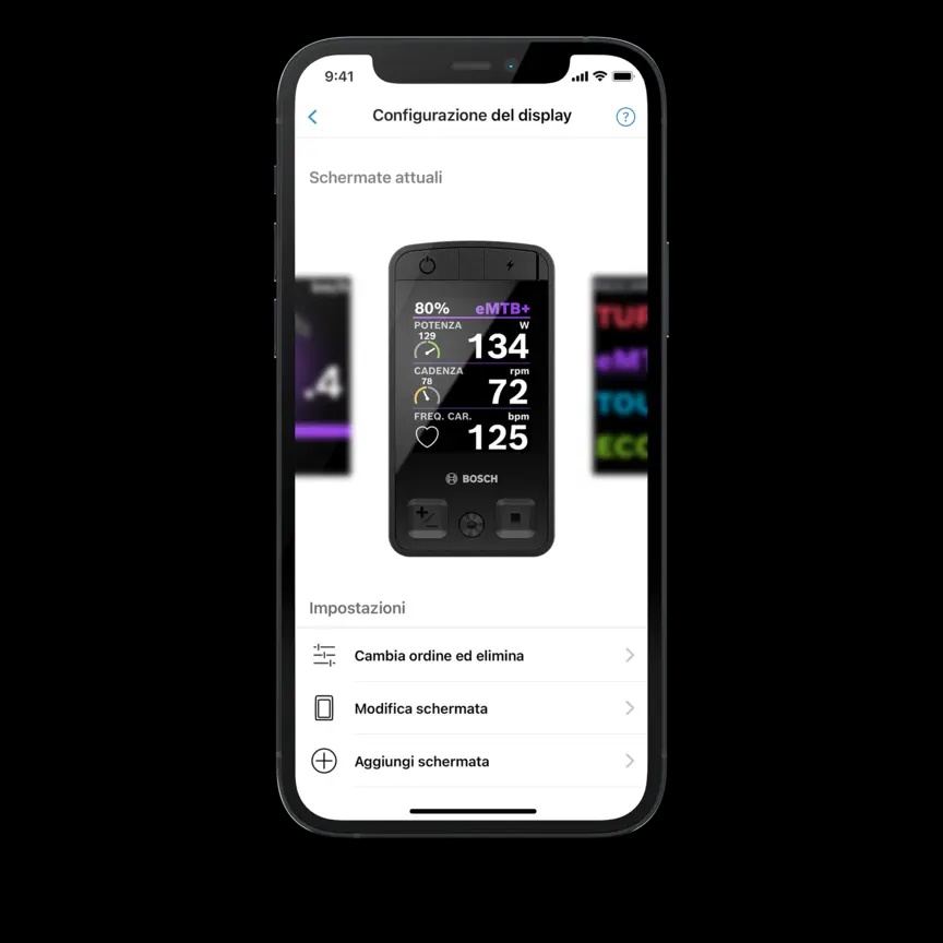 Nelle impostazioni dell’app eBike Flow puoi usare la funzione “Configurazione del display” per aggiungere contenuti come sempre, modificare o eliminare schermate e determinarne la sequenza e la disposizione.