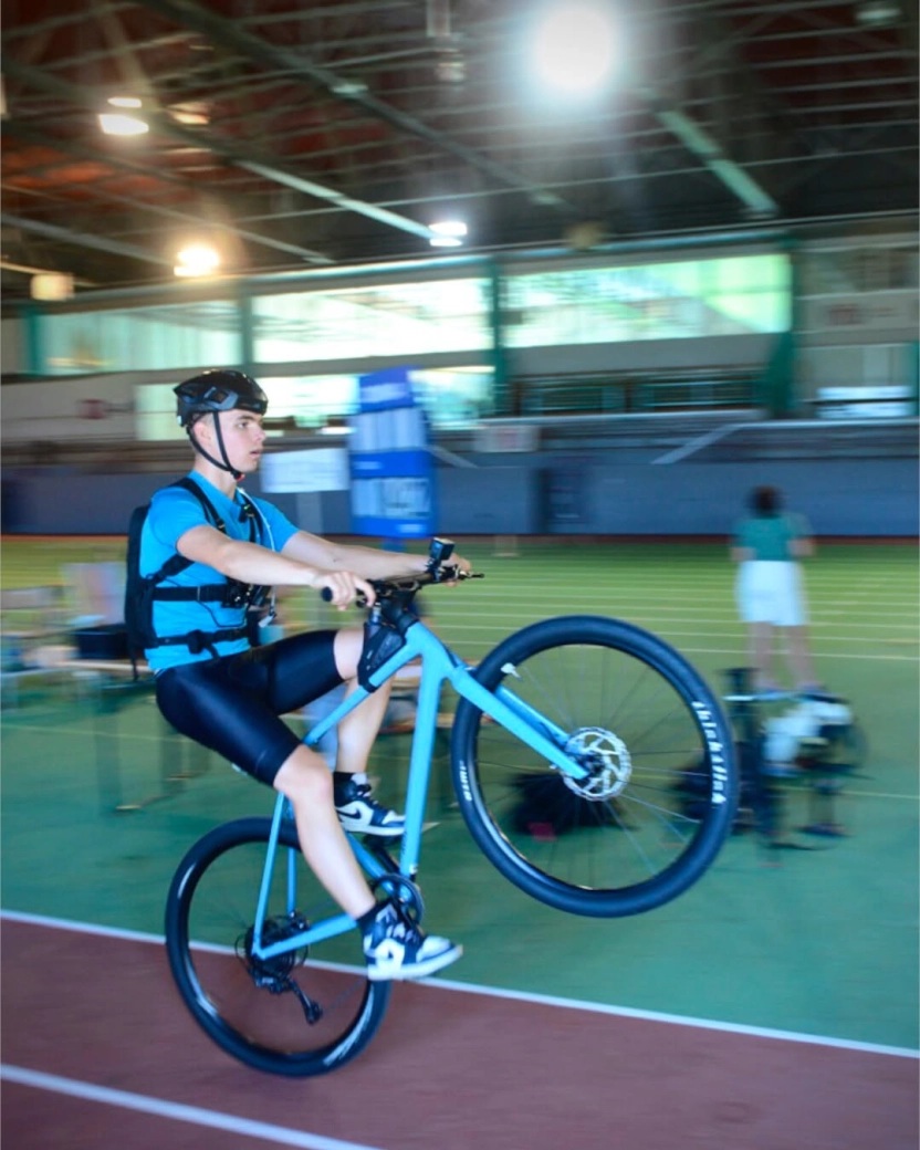 La bici utilizzata per questo record è stata una Rose dotata di pneumatici slick a grande diametro e con la sella inclinata verso il basso, vista la continua posizione assunta dal corpo per mantenere un’impennata così a lungo.
