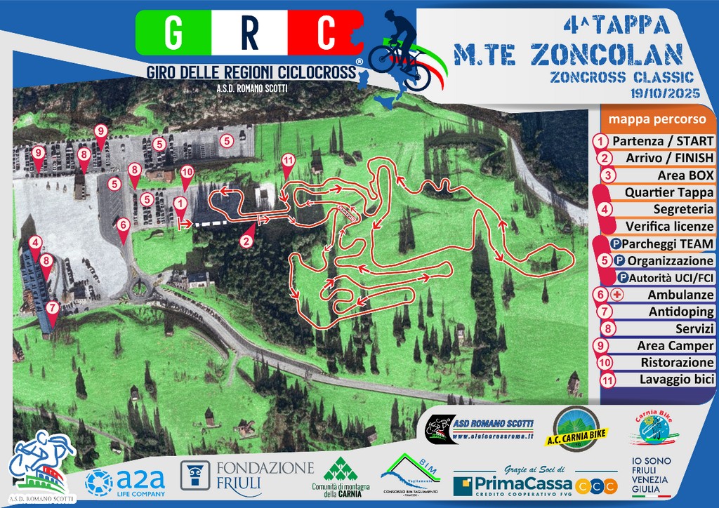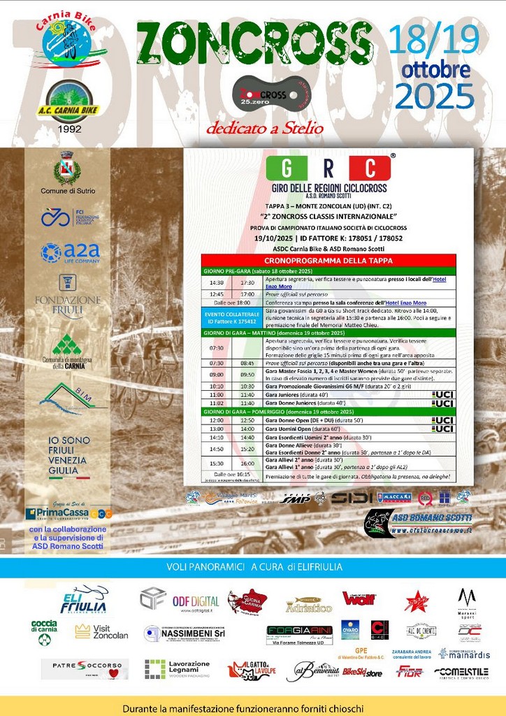 Dopo l’edizione sperimentale del 2024, inserita nel circuito Triveneto, il percorso dello Zoncolan è stato promosso a pieni voti per il GRC: un tracciato esigente, tecnico, atleticamente selettivo, immerso in un ambiente naturale mozzafiato. Saliscendi continui, curve strette, rilanci e passaggi spettacolari si snodano in un anfiteatro naturale che offre una visibilità eccezionale per il pubblico. Una gara così, in Italia, non ha eguali, e si chiamerà 2° Zoncross Classic, dedicato a Stelio. La tappa sarà di rango internazionale, di classe C2 sotto l’egida dell’UCI, ma avrà anche una rilevante importanza nazionale: sarà infatti valida come terzo appuntamento del Campionato Italiano per Società indetto dalla Federazione Ciclistica Italiana.
