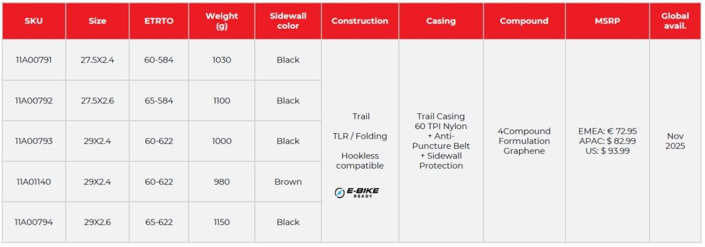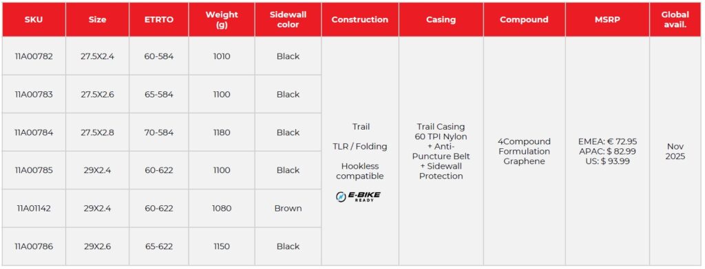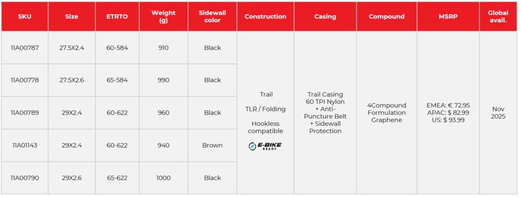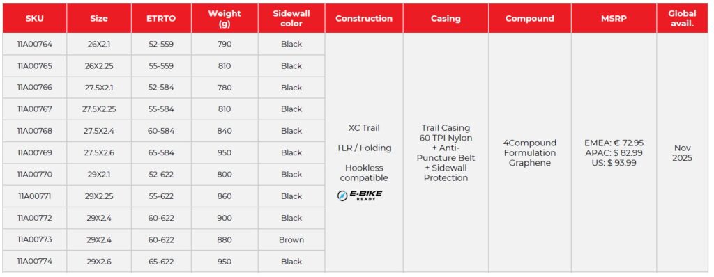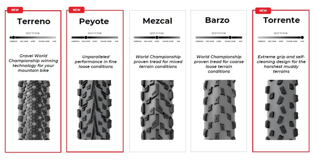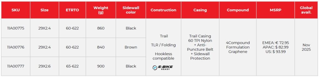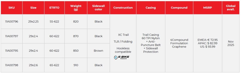 Ogni modello, nella misura più popolare 29×2.4, sarà disponibile con spalla nera o marrone, per offrire ai rider non solo la massima funzionalità, ma anche la libertà di scegliere il look che preferiscono. La maggior parte dei prodotti è disponibile anche nella misura 29×2.6, mentre solo i disegni Cross-Country sono disponibili anche in 29×2.25.