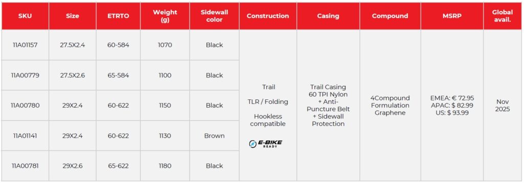 • Battistrada Trail 4C: quattro mescole con Graphene per ridurre la resistenza al rotolamento, aumentare il grip e prolungare la durata.