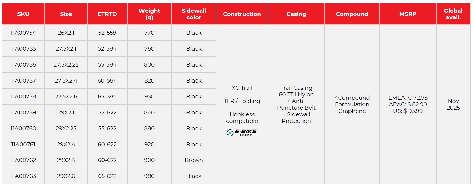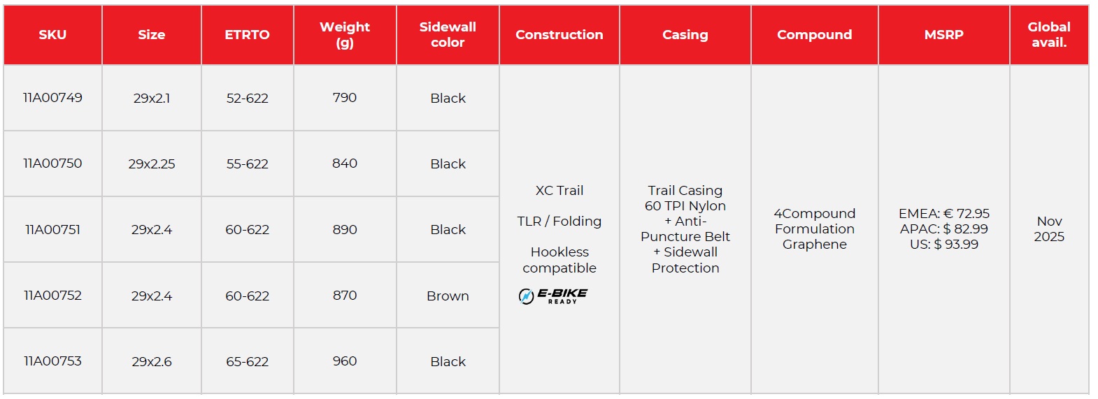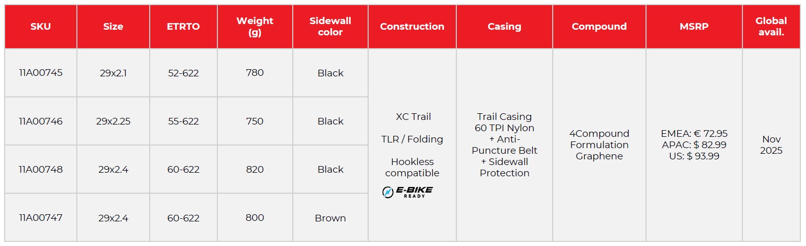 Ogni modello, nella misura più popolare 29×2.4, sarà disponibile con spalla nera o marrone, per offrire ai rider non solo la massima funzionalità, ma anche la libertà di scegliere il look che preferiscono. La maggior parte dei prodotti è disponibile anche nella misura 29×2.6, mentre solo i disegni Cross-Country sono disponibili anche in 29×2.25.