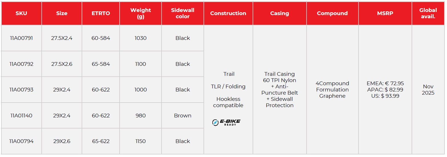 • Battistrada Trail 4C: quattro mescole con Graphene per ridurre la resistenza al rotolamento, aumentare il grip e prolungare la durata.