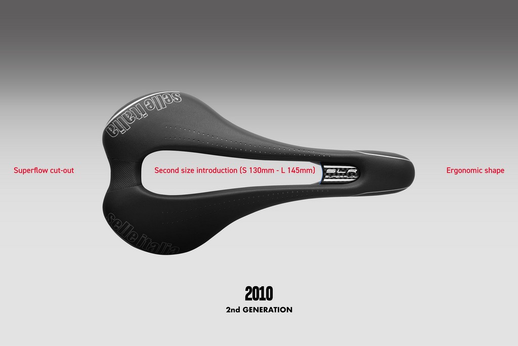 Fu anche l’anno del debutto del celebre foro Superflow, studiato per alleviare la pressione perineale e migliorare il comfort in sella — una caratteristica che sarebbe diventata un pilastro di tutte le SLR successive. La seconda generazione introdusse inoltre le ali laterali, che garantirono maggiore stabilità in sella e un’estetica distintiva.