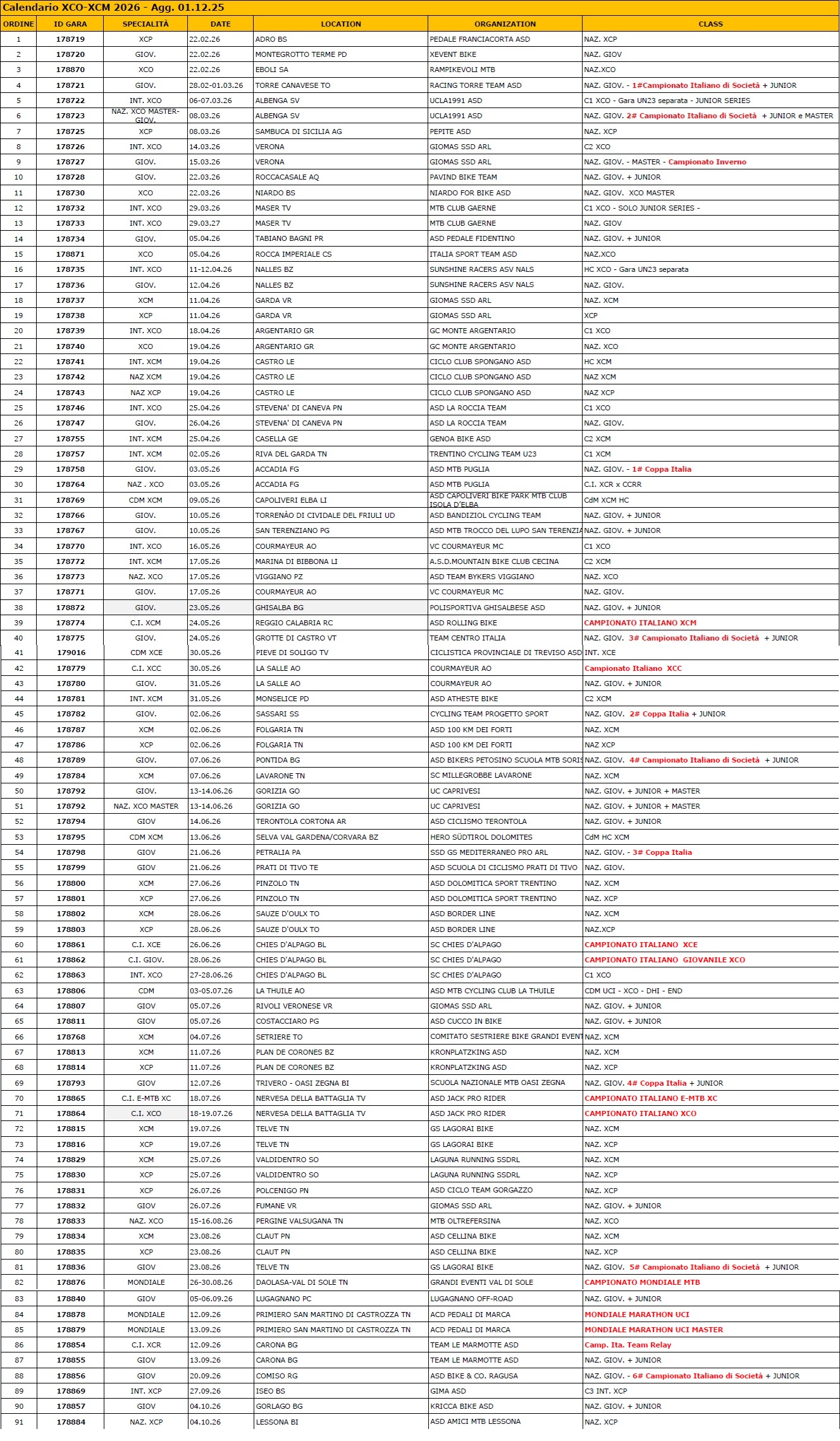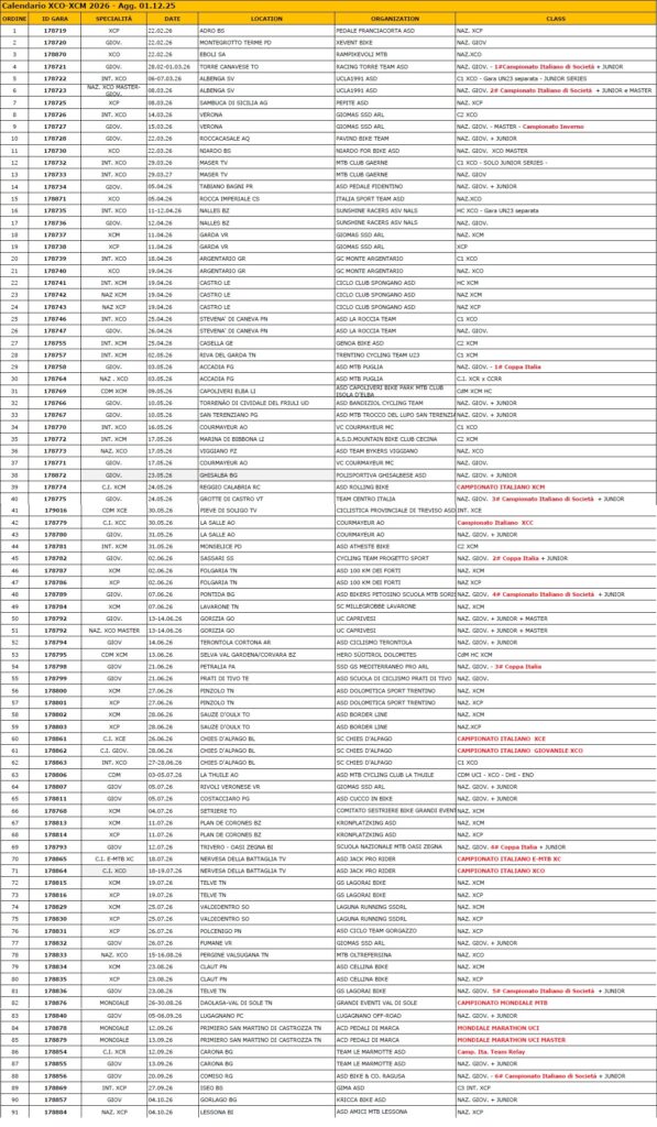 La Federazione Ciclistica Italiana ha pubblicato l’aggiornamento del calendario delle gare nazionali e internazionali XCO e granfondo del 2026. (cliccare sull’immagine per ingrandirla)