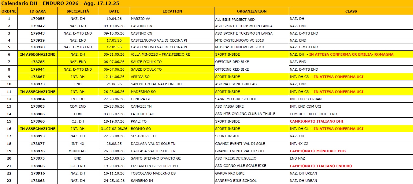 La Federazione Ciclistica Italiana ha pubblicato l’aggiornamento del calendario delle gare nazionali e internazionali enduro e downhill del 2026. (cliccare sull’immagine per ingrandirla)