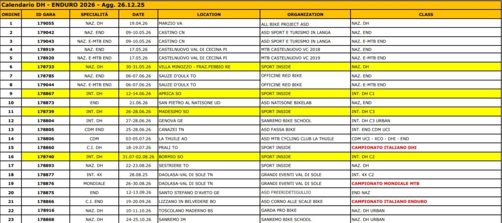 La Federazione Ciclistica Italiana ha pubblicato l’aggiornamento del calendario delle gare nazionali e internazionali enduro e downhill del 2026. (cliccare sull’immagine per ingrandirla)