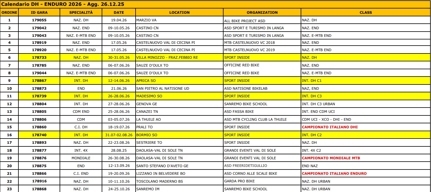 La Federazione Ciclistica Italiana ha pubblicato l’aggiornamento del calendario delle gare nazionali e internazionali enduro e downhill del 2026. (cliccare sull’immagine per ingrandirla)