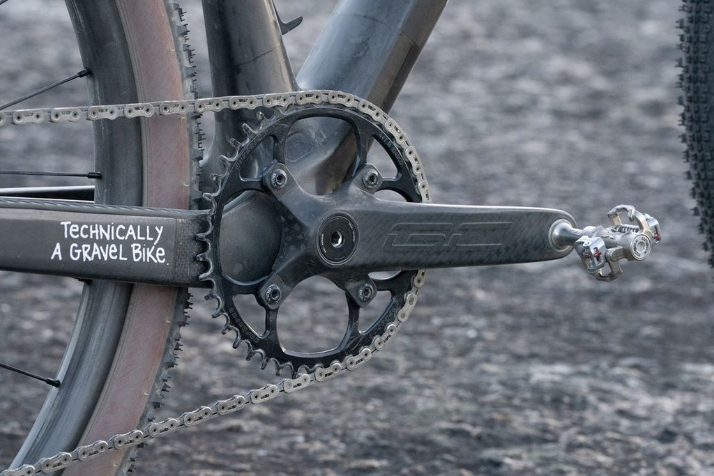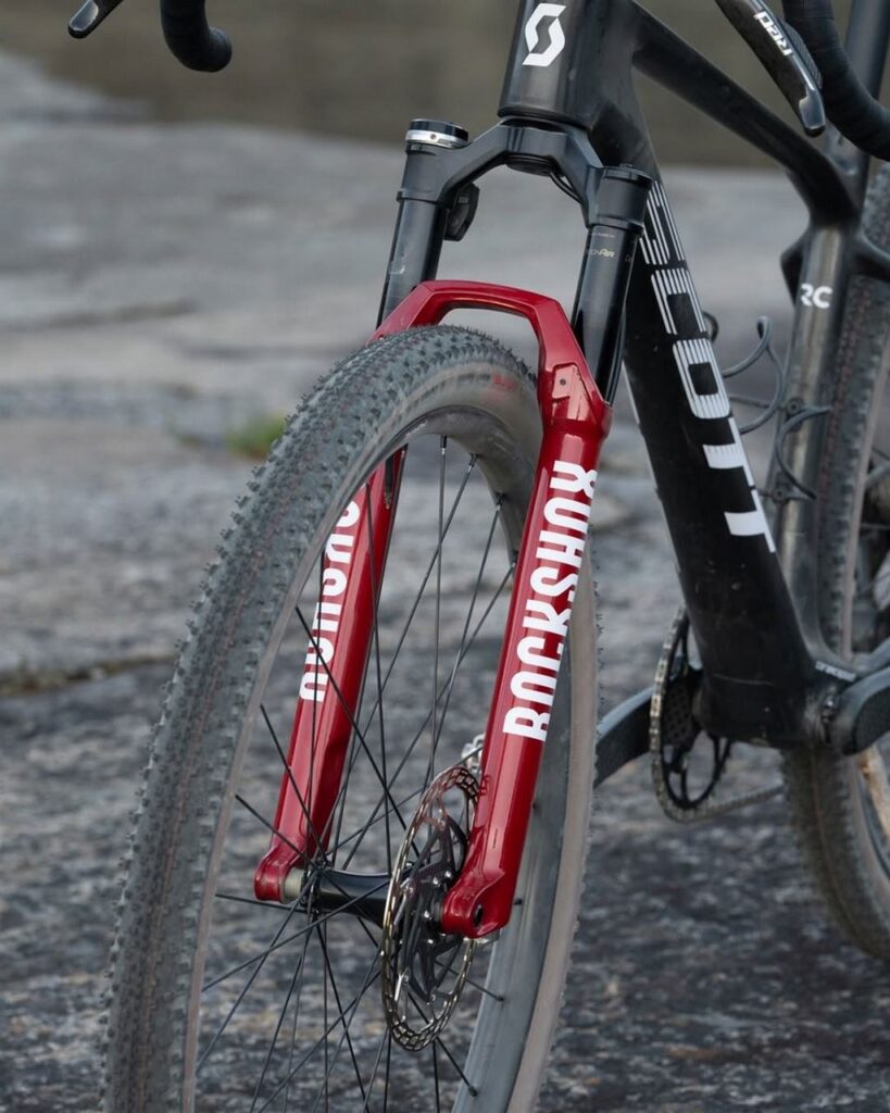 Ruote e pneumatici: Dangerholm ha optato per cerchi in carbonio personalizzati con canale interno da 40 mm, una larghezza che permette di montare pneumatici più larghi a pressioni basse per maggiore comfort e grip. I mozzi sono Tune, noti per la loro leggerezza, e gli pneumatici Schwalbe Thunder Burt da 2.1″ offrono un equilibrio ideale tra scorrevolezza e trazione su sterrato.