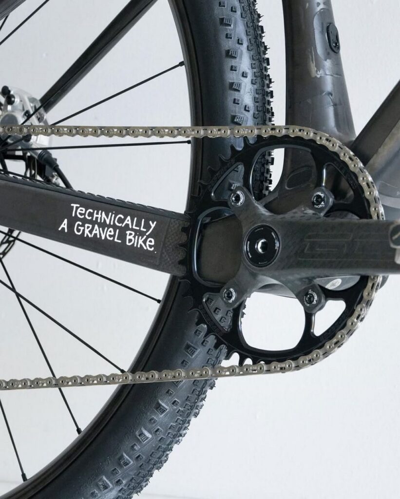 Dangerholm, pseudonimo di un meccanico e designer appassionato, ha sempre puntato a creare bici che sembrano impossibili. Partendo dal telaio Scott Scale RC SL – un modello iconico nel mondo delle mountain bike cross-country – ha deciso di adattarlo al gravel, un settore in rapida evoluzione che mescola elementi da strada, ciclocross e MTB. Il telaio in carbonio HMX premium è stato privato della vernice originale per esporre le fibre di carbonio nude, decorate con loghi bianchi e una striscia rossa sul tubo orizzontale. Un tocco personale? Una nota scritta a pennarello sul fodero catena: “tecnicamente una gravel”. Questo non è solo un vezzo estetico, ma un’affermazione ironica che sottolinea la versatilità del progetto.