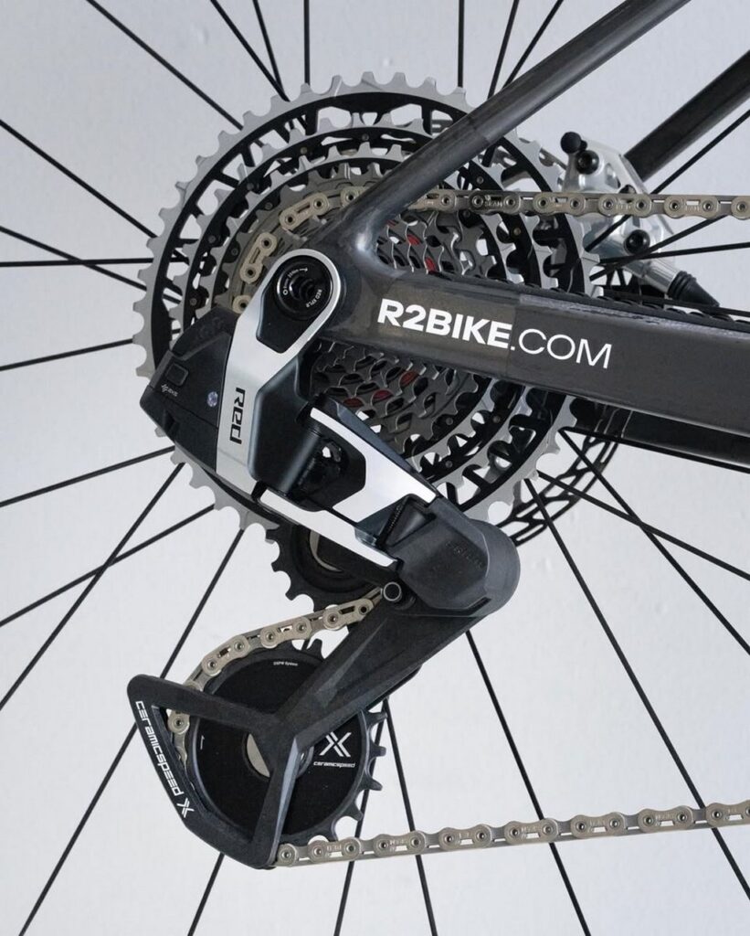 Trasmissione: Il gruppo elettronico SRAM Red XPLR a 13 velocità, con cassetta fino a 46 denti, è il più leggero disponibile. Aggiunge una corona Garbaruk in carbonio da 44 denti, pedivelle Grigiocarbonio e una gabbia CeramicSpeed per una fluidità impeccabile.