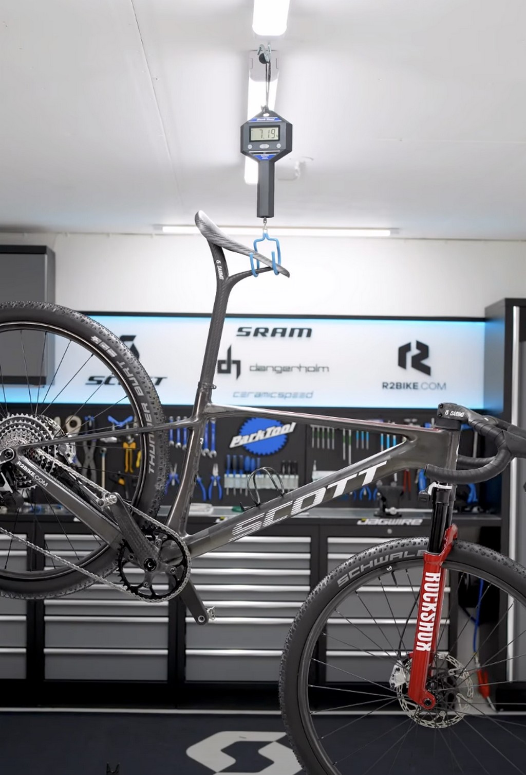Il peso totale? Un impressionante 7,19 kg, inclusi forcella ammortizzata, ruote larghe e reggisella telescopico. Per contestualizzare, una gravel standard spesso supera i 9-10 kg; qui, Dangerholm ha creato un mostro leggero che compete con le bici da salita più estreme.